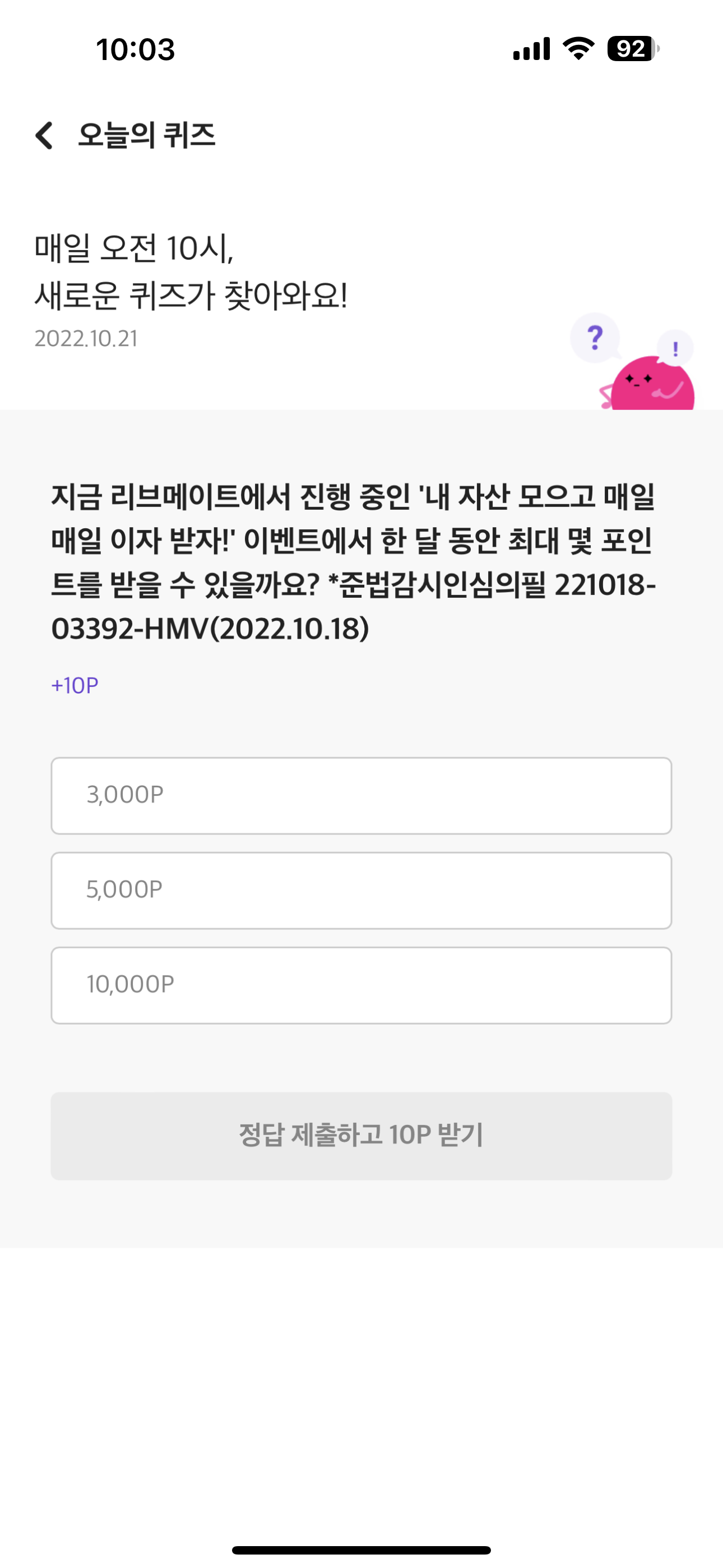 문제는 다음과 같습니디ㅏ. 지금 리브메이트에서 진행 중인 '내 자산 모으고 매일 매일 이자 받자!' 이벤트에서 한 달 동안 최대 몇 포인트를 받을 수 있을까요? 준법감시인심의필 221018-03392HMV (2022.10.18) 보기는 3,000P, 5,000P, 10,000P 입니다. 10포인트를 받을 수 있는 이 정답은