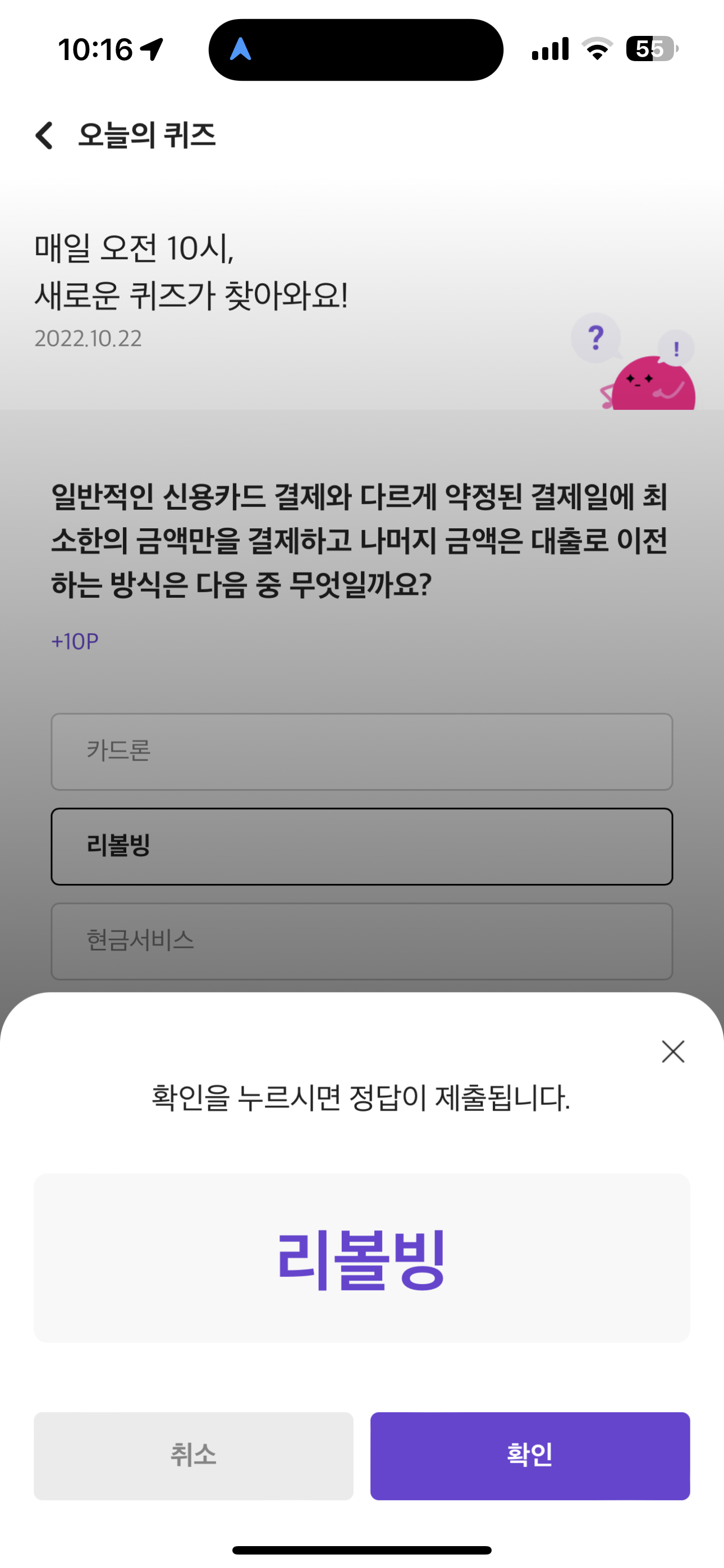 러브메이트 오늘의 퀴즈 정답은 리볼빙 입니다. 상식적으로도 알아 두면 좋으니 꼭 기억해 두세요