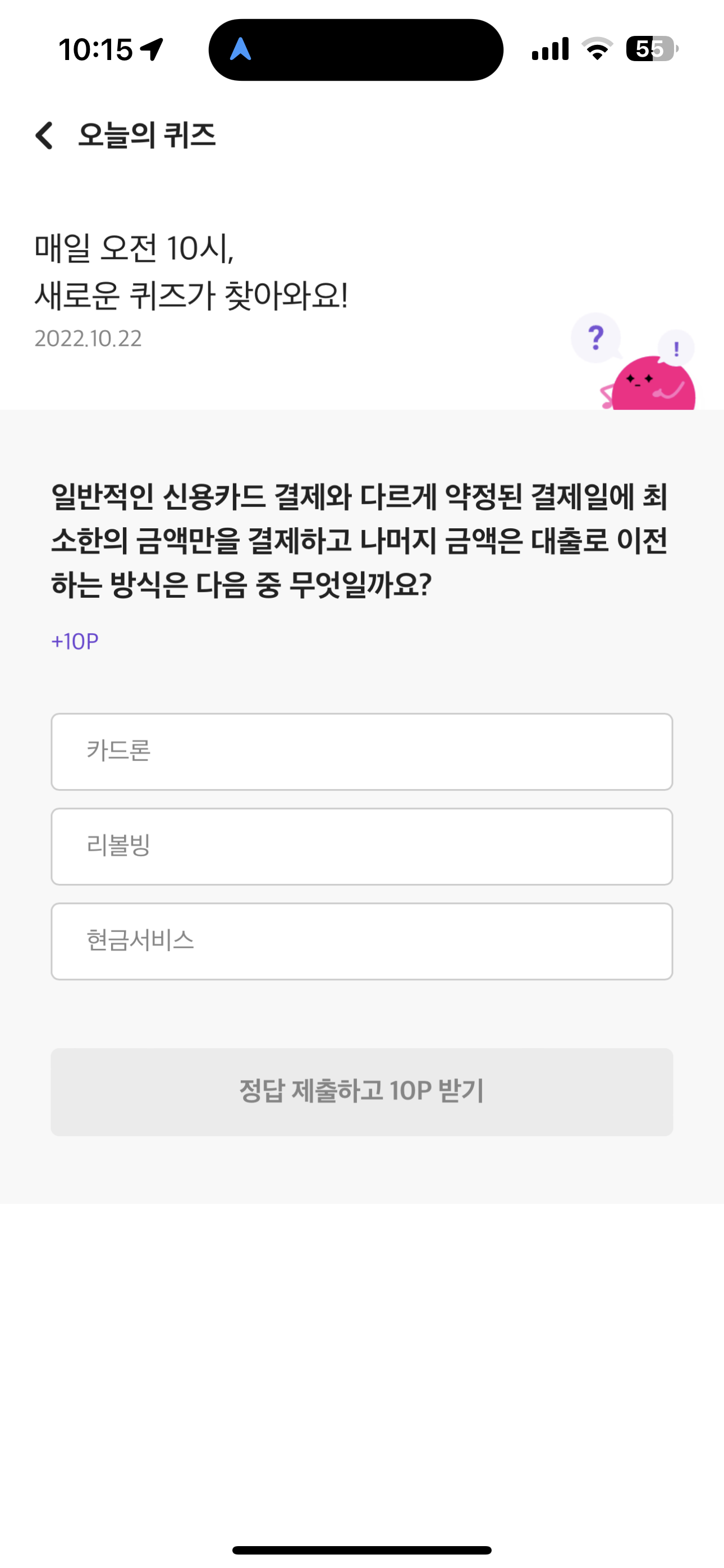 러브메이트 오늘의 퀴즈 문제는 일반적인 신용카드 결제와 다르게 약정된 결제일에 최소한의 금액만을 결제하고 나머지 금액은 대출로 이전하는 방식은 다음 중 무엇일까요? 입니다. 오늘 문제는 쉽지만 많이 실수할 수 있는 문제인데요.