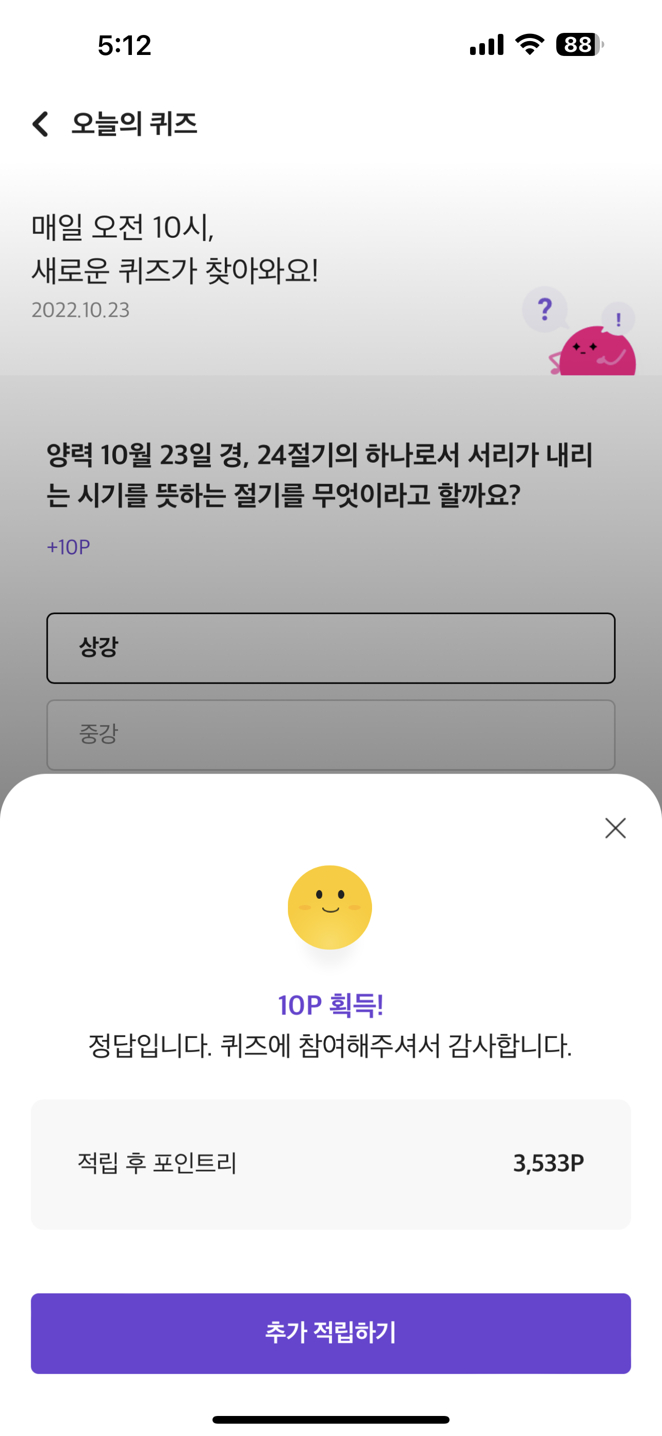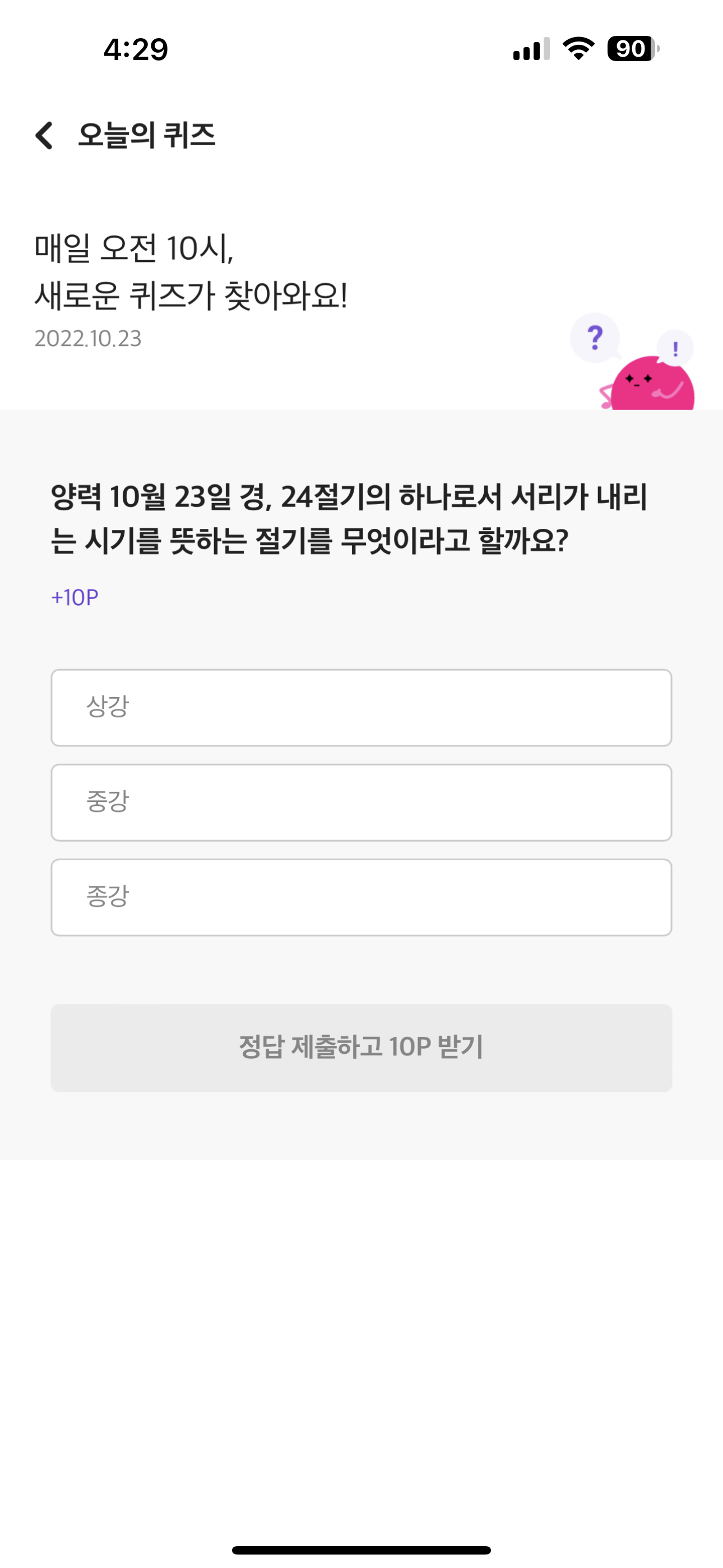 러브메이트 오늘의 퀴즈 10월 23일 정답 ( 양력 10월 23일 경, 24절기의 하나로서 서리가 내리는 시기를 뜻하는 절기)
