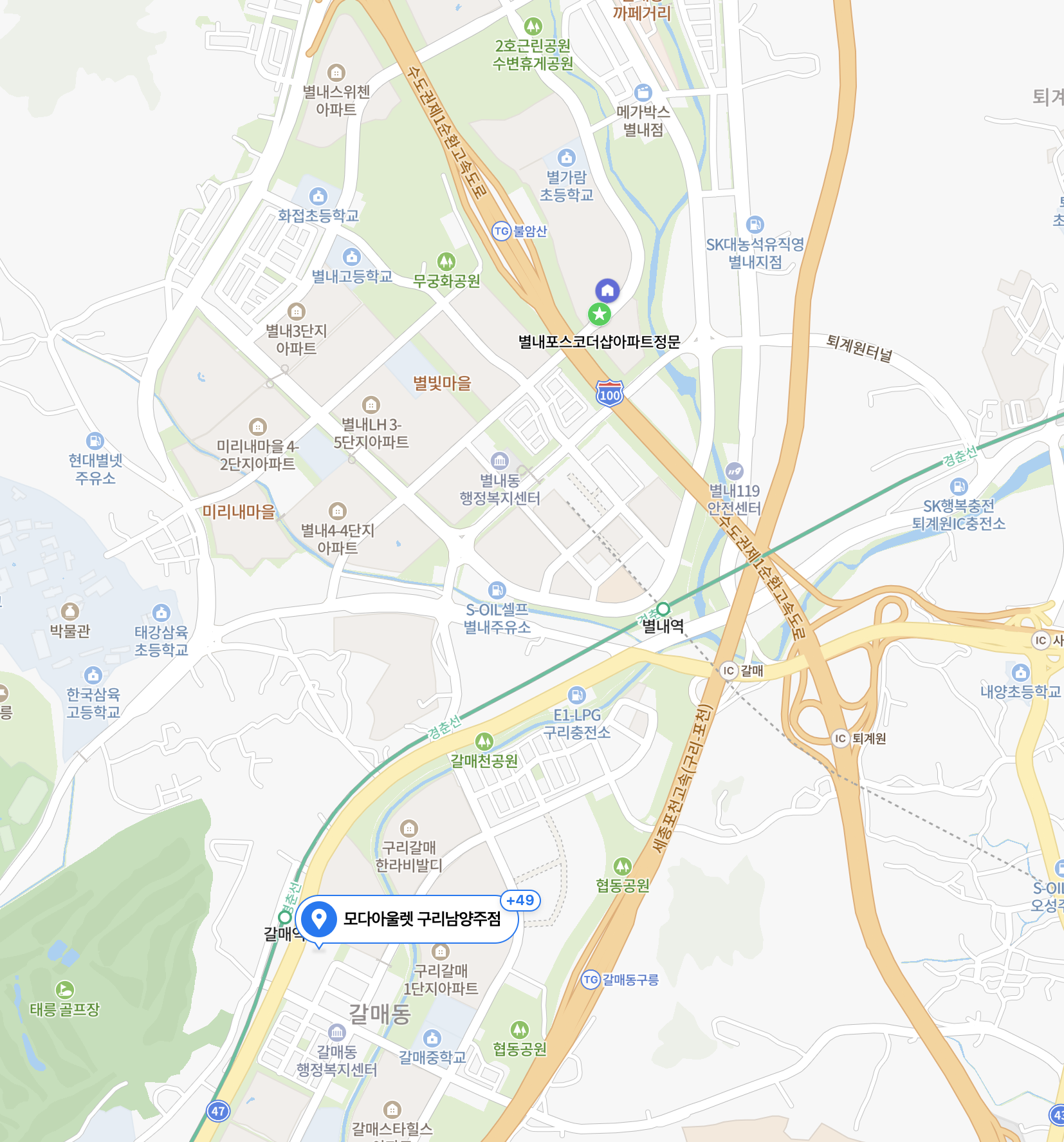 구리 모다아울렛 수퍼차저는 별내동, 갈매동 경계에 위치한 곳으로 지역상은 구리지만 남양주시 별내동하고도 가까워 별내동에 사는 사람들도 접근성이 좋은 곳입니다. 예전에는 무조건 하남 스타필드 수퍼차저로 갔어야 했는데 이제 가까운 곳에 생겼기 때문에 분산도 되고 테슬라 충전을 더욱 쉽게 할 수 있게 되었습니다.