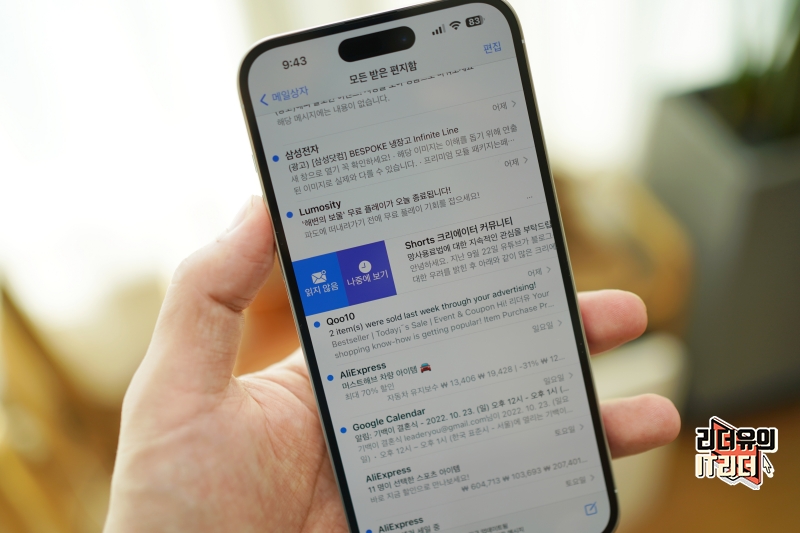 그리고 중요 메일일 경우 나중에 다시 확인을 위해 나중에 보기를 할 수 있습니다. 옆으로 스와이프 하면 해당 메뉴가 나옵니다.