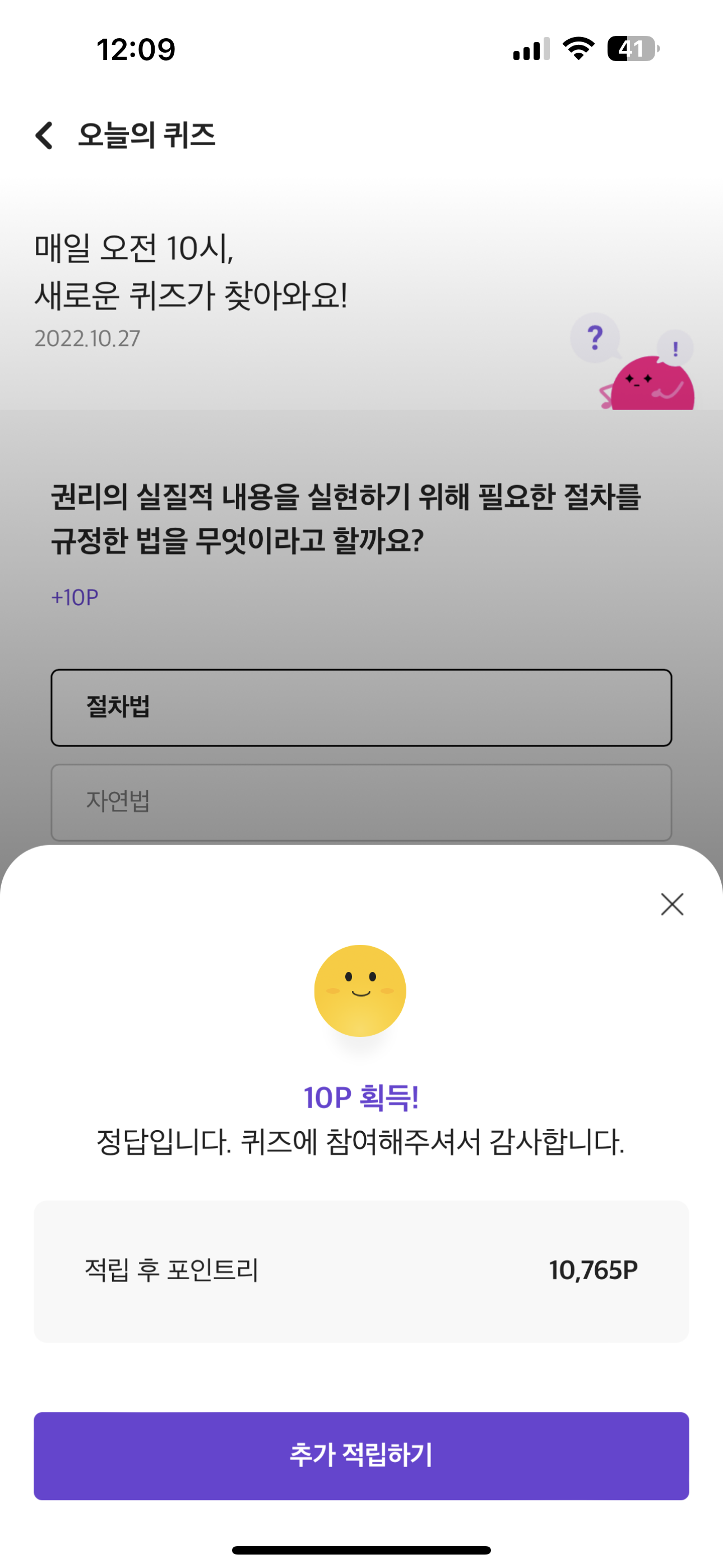 오늘도 10포인트를 획득했습니다. 러브메이트 오늘의 퀴즈 포인트는 현금으로 전환이 가능하니 매일 매일 놓치지 마세요! 재테크 화이팅 입니다.