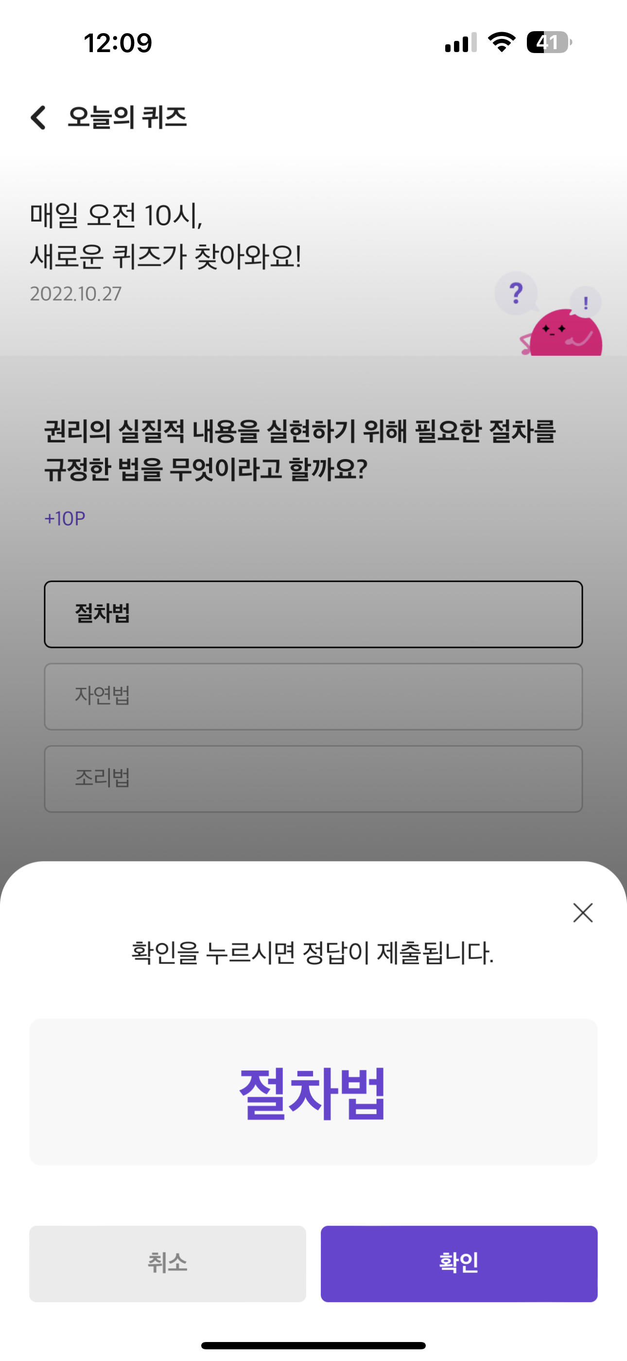 권리의 실질적 내용을 실현하기 위해 필요한 절차를 규정한 법을 무엇이라고 할까요? 법 내용이라 하니 어렵게 다가오지만 모든 문제의 답은 문제에 있다고 하죠. 보기가 절차법, 자연법, 조리법으로 되어 있는데 딱 문제에 답을 명시하고 있습니다. 바로 러브메이트 오늘의 퀴즈 정답은