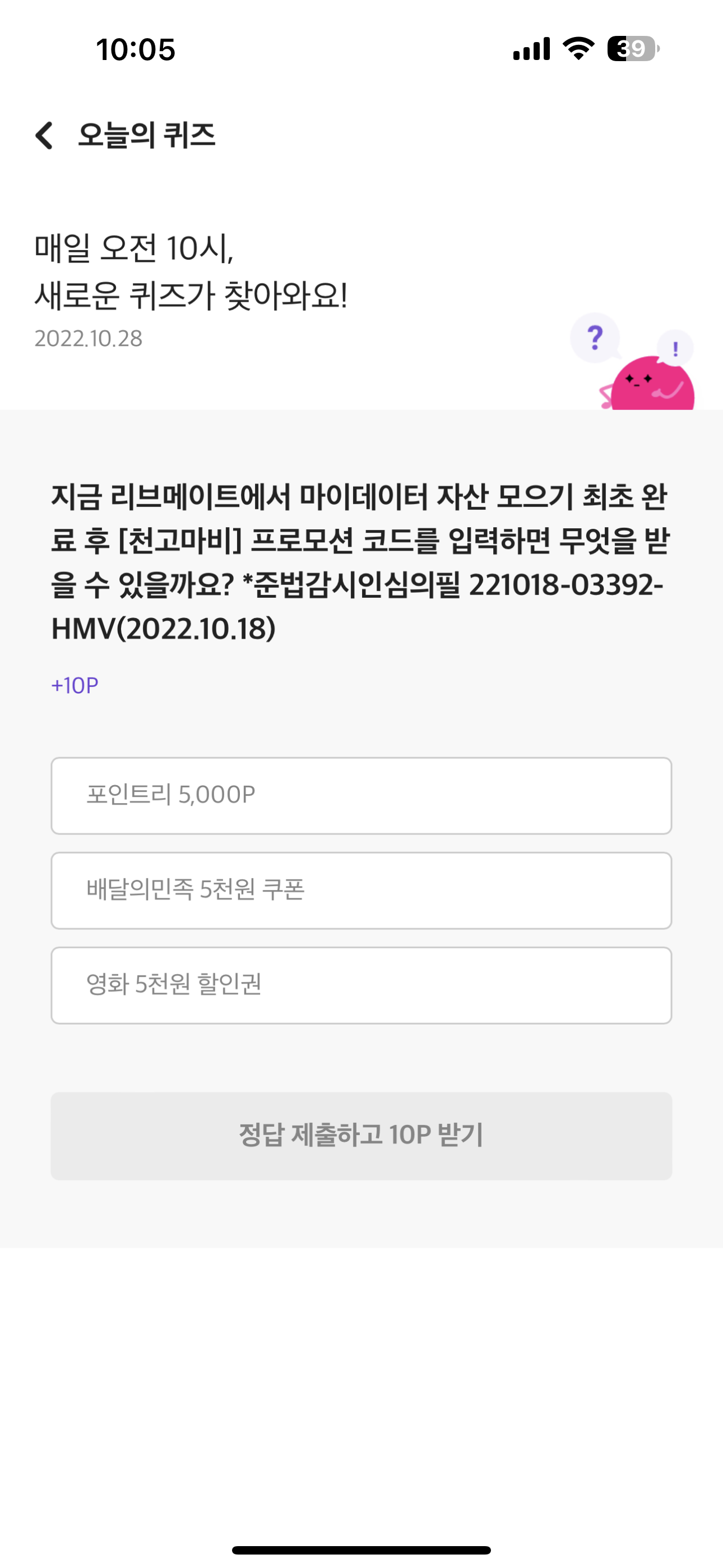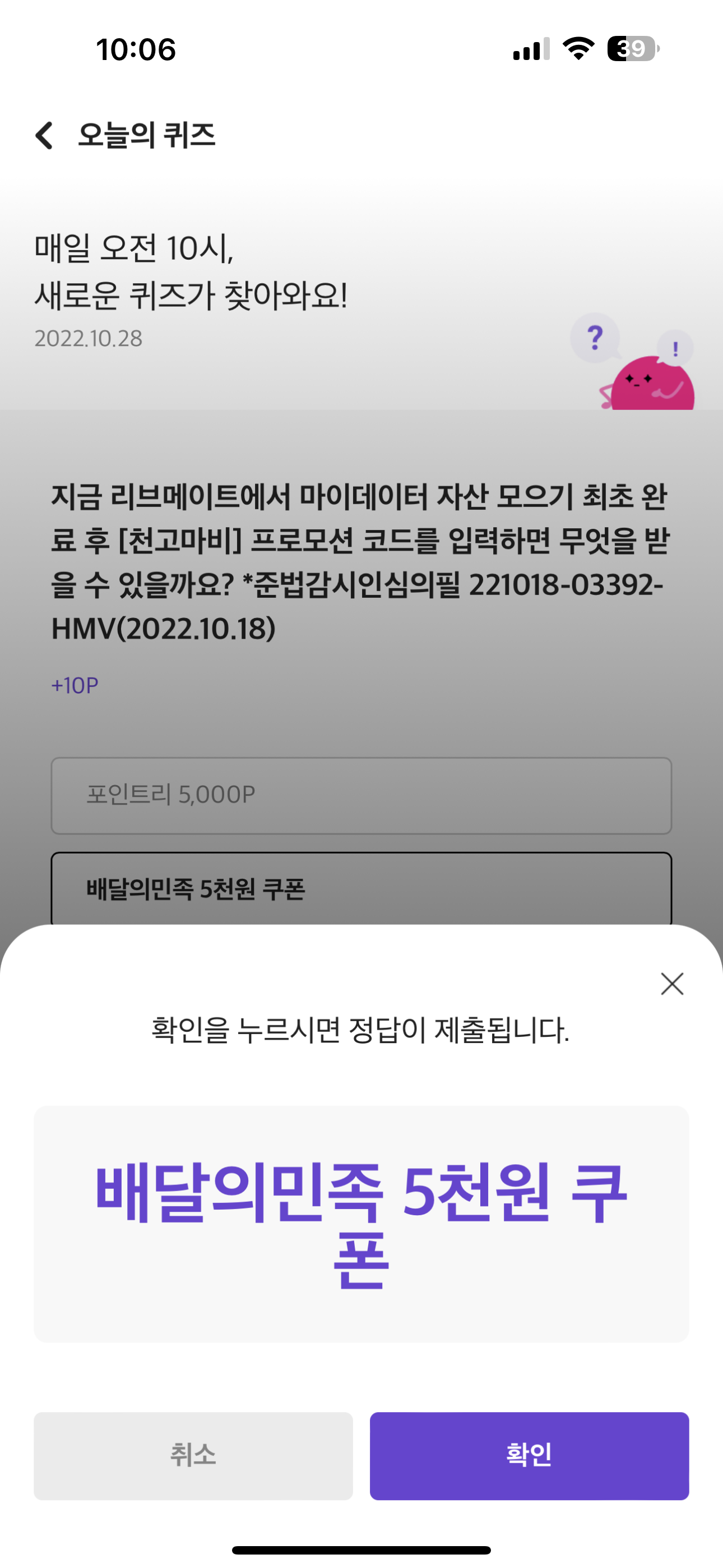 2022년 10월 28일 오늘의 퀴즈 정답은 배달의민족 5천원 쿠폰 입니다.