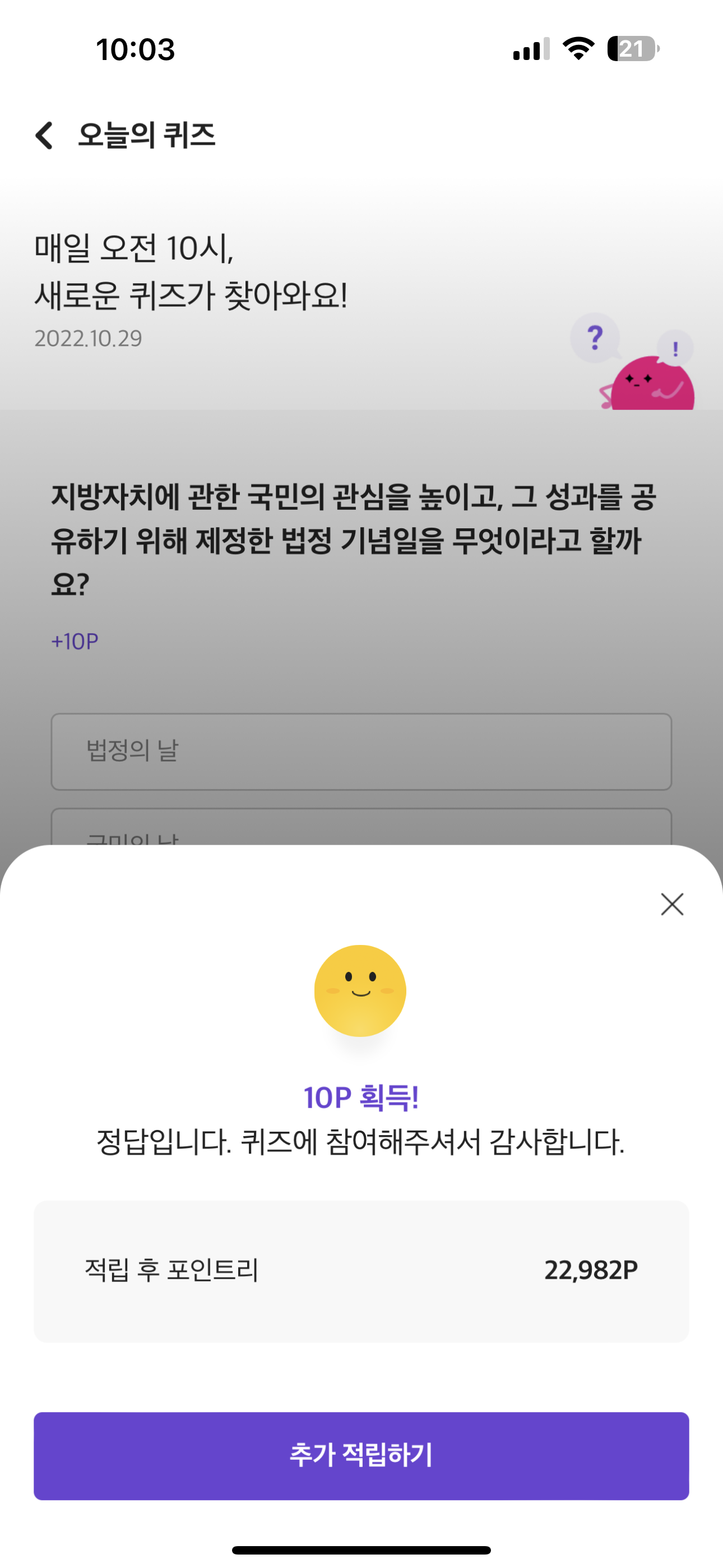 리브메이트 오늘의 퀴즈 문제는 지방자치에 관한 국민의 관심을 높이고, 그 성과를 공유하기 위해 제정한 법정 기념일을 무엇이라고 할까요? 입니다. 언제나 정답은 문제에서 찾을 수 있다고 했죠. 오늘의 퀴즈는 더욱 명확하게 답을 보여주고 있습니다.