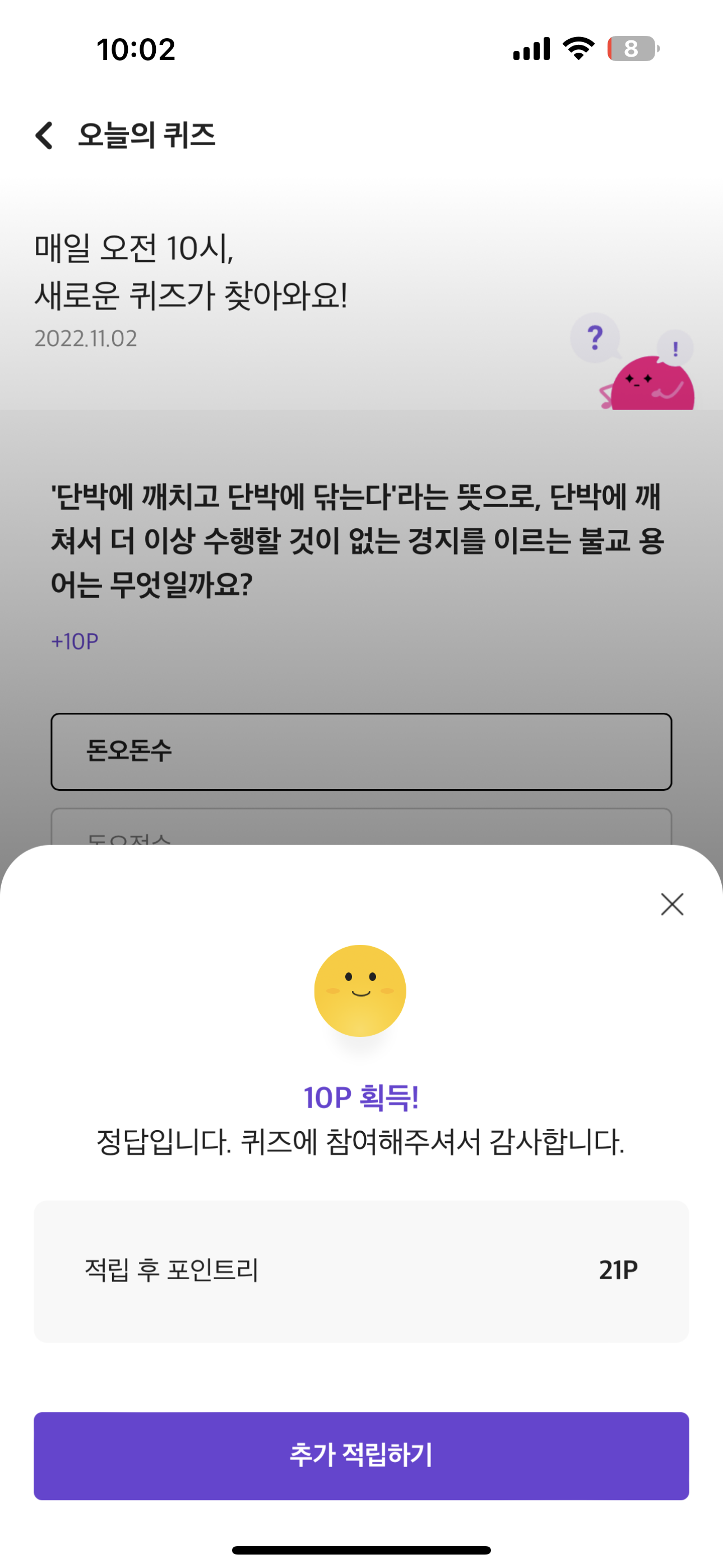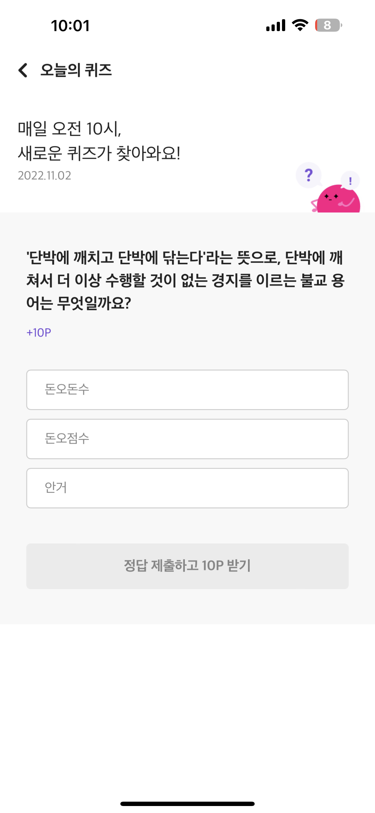 리브메이트 오늘의 퀴즈 정답은 돈오돈수 입니다.