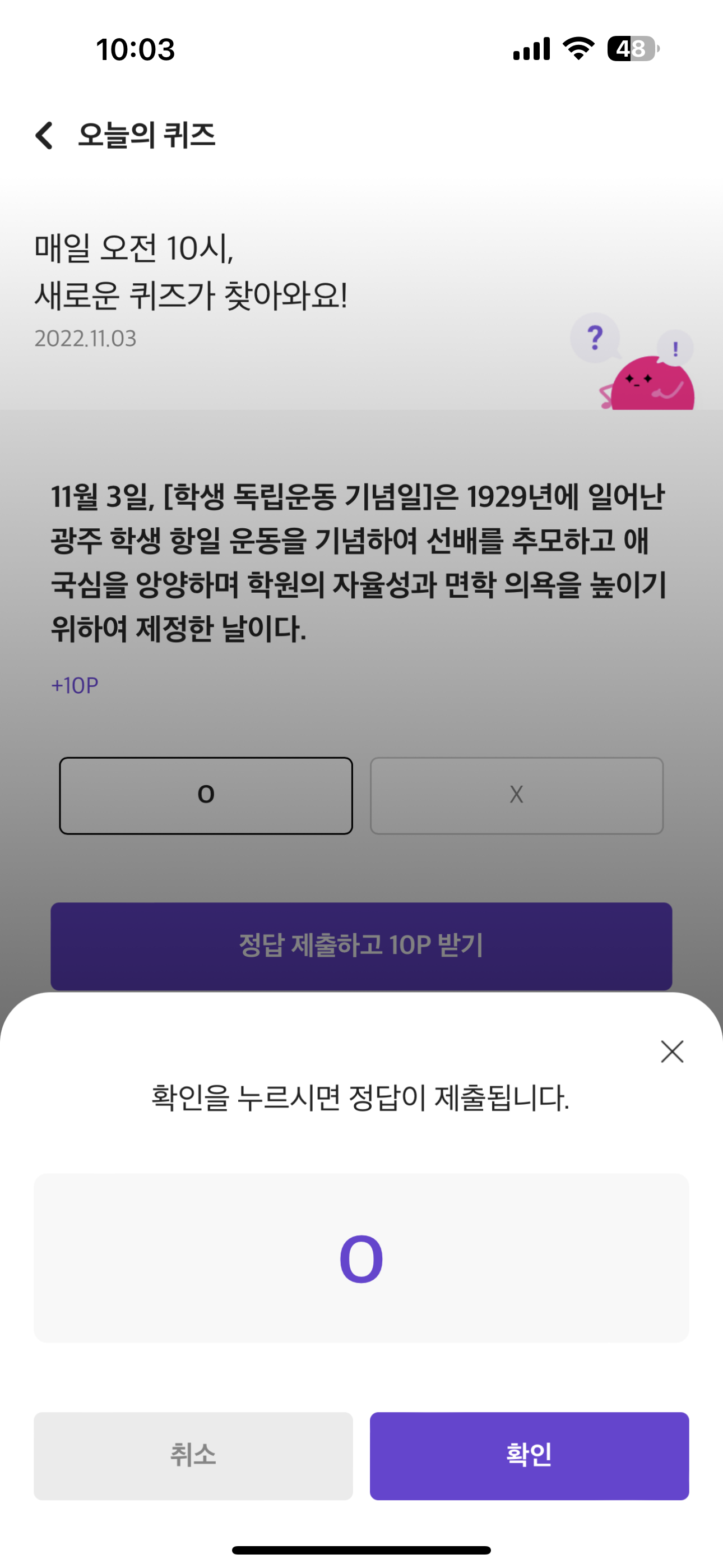 오늘은 학생 독립운동 기념일을 모두가 알기 위해 O, X로 문제를 던졌습니다. 즉, 오늘의 문제 정답은