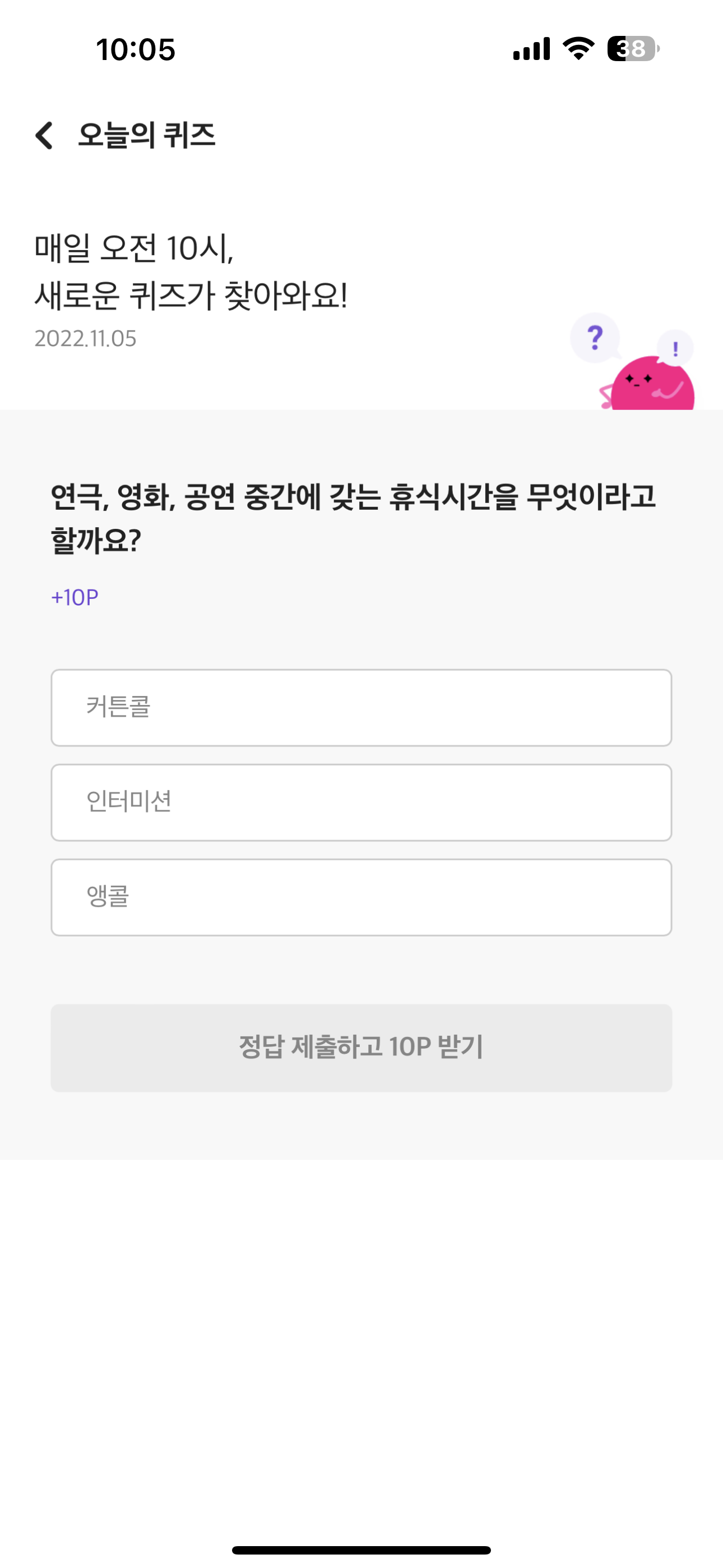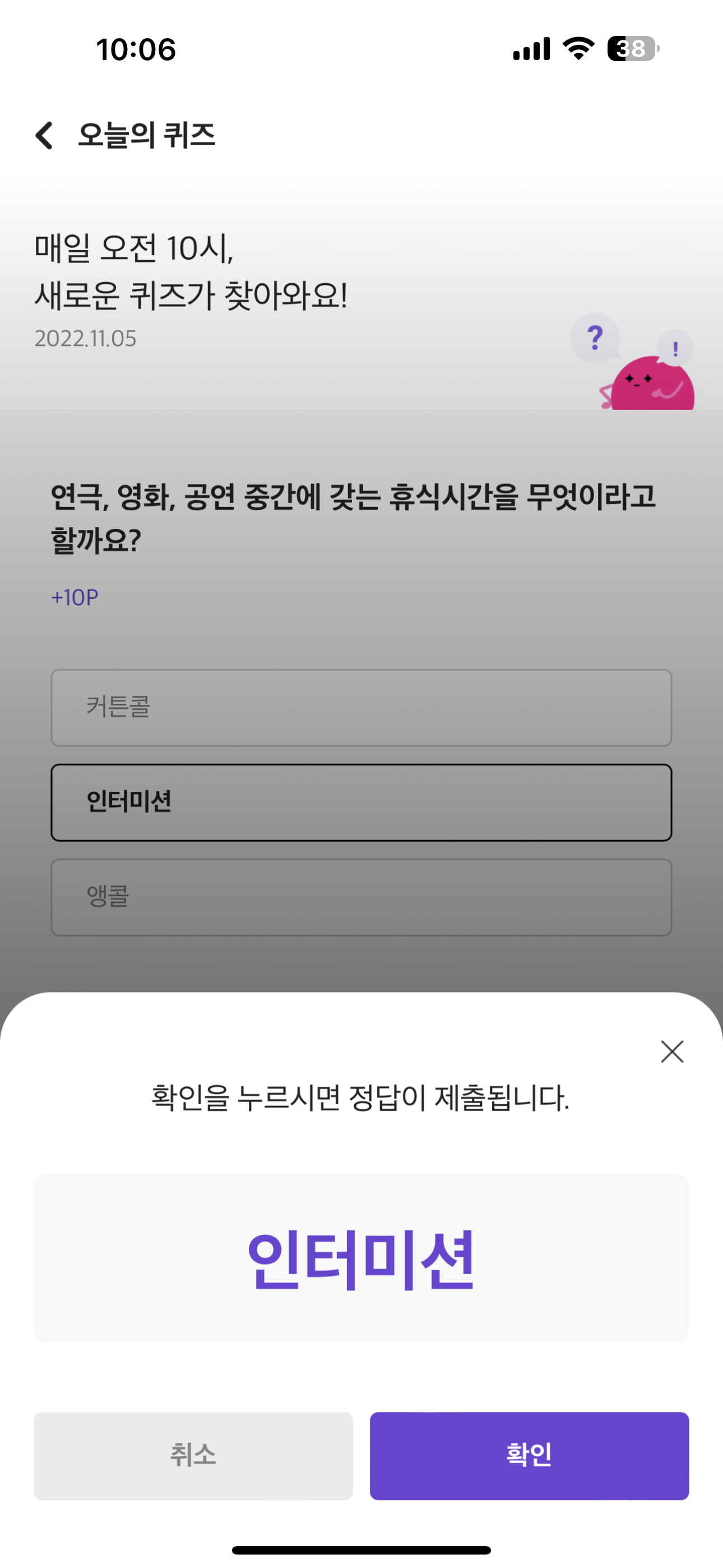 연극, 영화, 공연 중간에 갖는 휴식시간을 무엇이라고 할까요? 오늘 문제는 익숙하면서도 쉽게 실수 할 수 있는 문제입니다. 보기는 1. 커튼콜, 2. 인터미션, 3. 앵콜 입니다. 여기서 앵콜은 당연히 아닌거 알죠.. 그리고 커튼콜은 연극이나 음악회 따위의 공연이 끝나고 막이 내린 뒤, 관객이 찬사의 표현으로 환성과 박수를 계속 보내어 무대 뒤로 퇴장한 출연자를 무대 앞으로 다시 나오게 불러내는 일입니다. 그래서 커튼콜입니다. 그럼 정답은