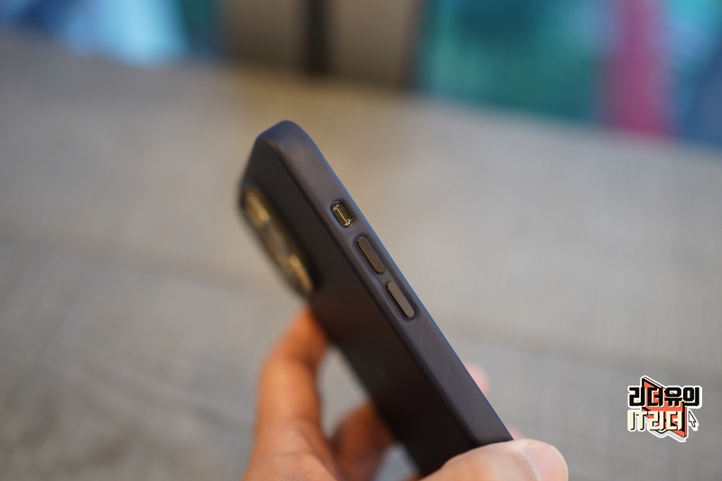 아이폰14 프로 맥스에 정품 맥세이프 가죽 케이스를 장착한 모습입니다. 전체적으로 두께가 얇아서 장착했을때 사이즈가 많이 커지지 않아서 좋습니다.