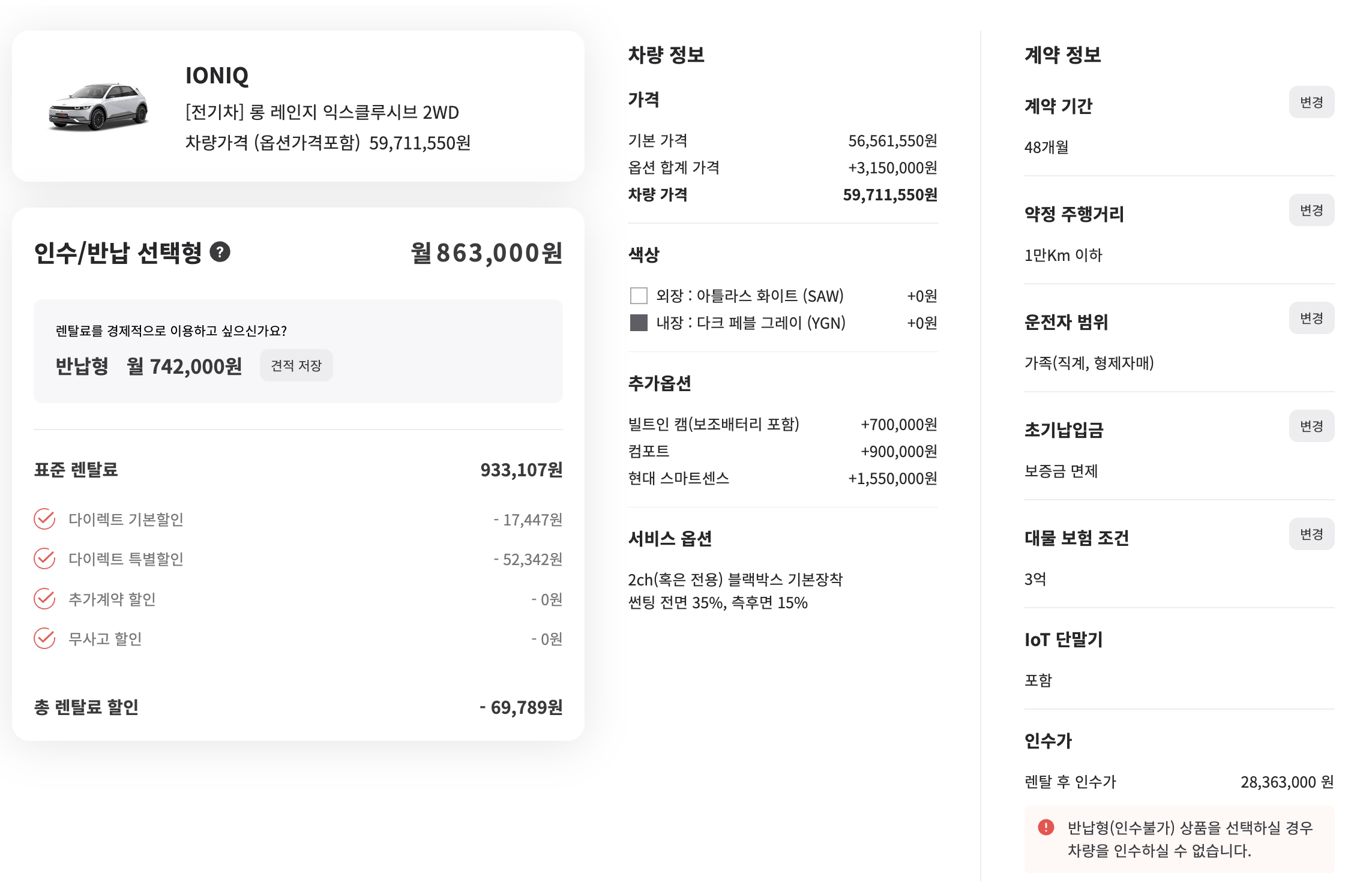 저는 보증금 없이 견적을 내봤는데요. 인수/반납 선택형은 월 863,000원, 반납형은 월 742,000원에 이용이 가능합니다. 선수금에 따라 가격적인 변동은 있으니 각자의 상황에 맞게 선택하시면 될 것 같습니다.