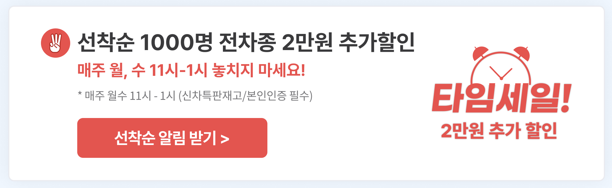 매주 월요일/수요일 오전 11시 1천명 선착순 당일/빠른배송 전 차종 2만원 타임 세일이 진행중입니다. 이벤트 페이지 접속 시 오른편에 타임세일 알림신청 팝업이 노출되는데요. 알림신청 후 타임세일 기간에 견적 확인하면 할인 혜택이 자동 적용됩니다.