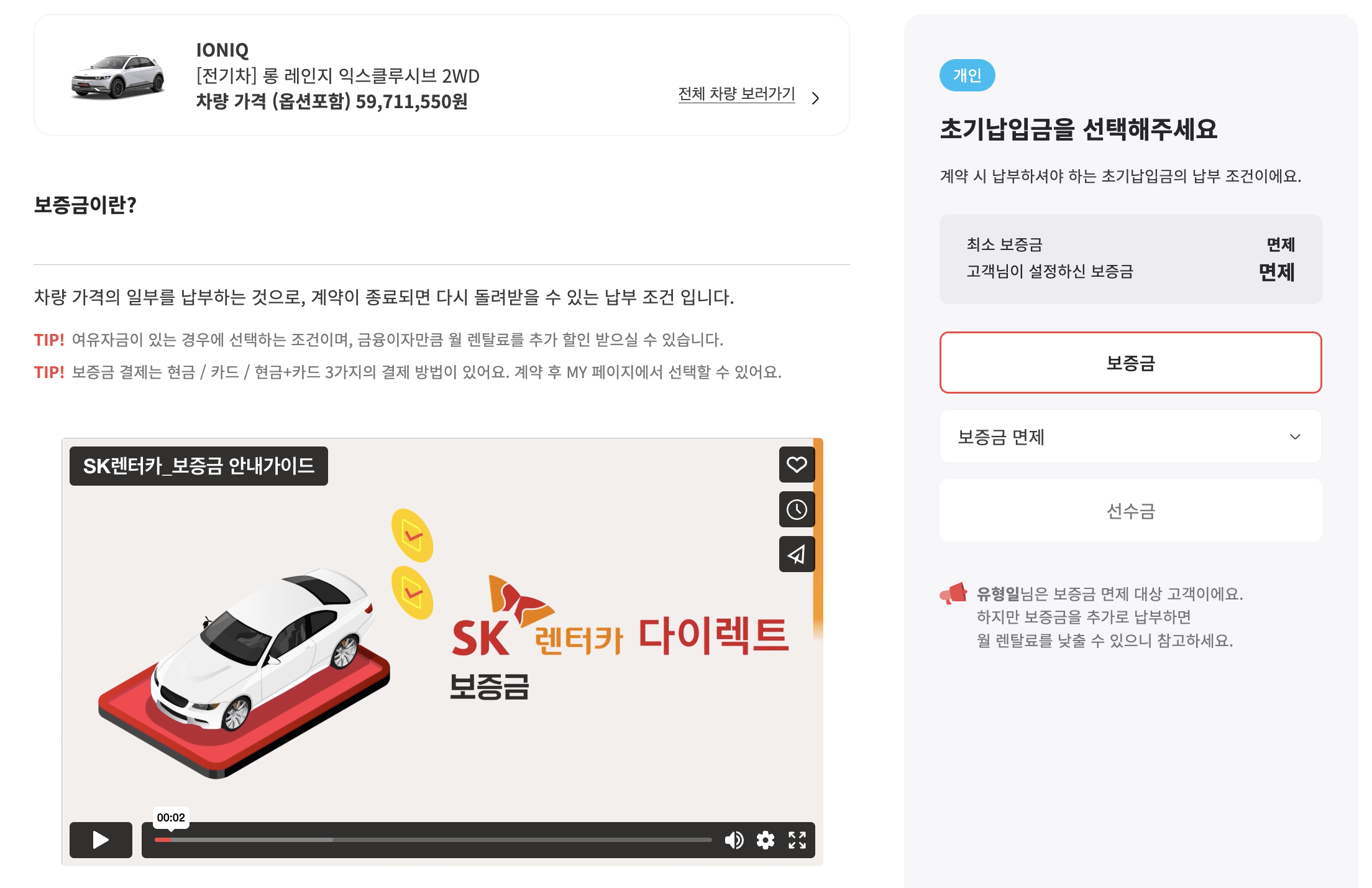 이제 초기 납입금을 선택할 수 있습니다. 보증금을 아예 내지 않고도 가능하고 선수금을 내면 매월 렌탈료가 낮아지는 구조입니다.