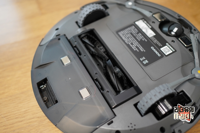 쿠쿠 로봇청소기 CRVC-ALV10IG 바닥면 모습입니다. 대형 바퀴 두개가 양쪽으로 있고 가운데 먼지 흡입구가 있습니다.