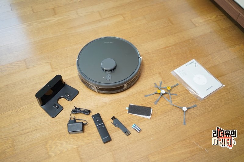 쿠쿠 로봇청소기 CRVC-ALV10IG 구성품은 본체, 충전 스테이션, 전원 어댑터, 리모컨, 청소용 브러쉬, 건전지, 먼지통 교체용 필터, 좌/우측 사이드 브러쉬로 구성되어 있습니다.