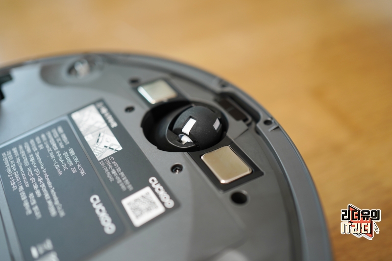 쿠쿠 로봇청소기 CRVC-ALV10IG 바닥면 모습입니다. 대형 바퀴 두개가 양쪽으로 있고 가운데 먼지 흡입구가 있습니다.