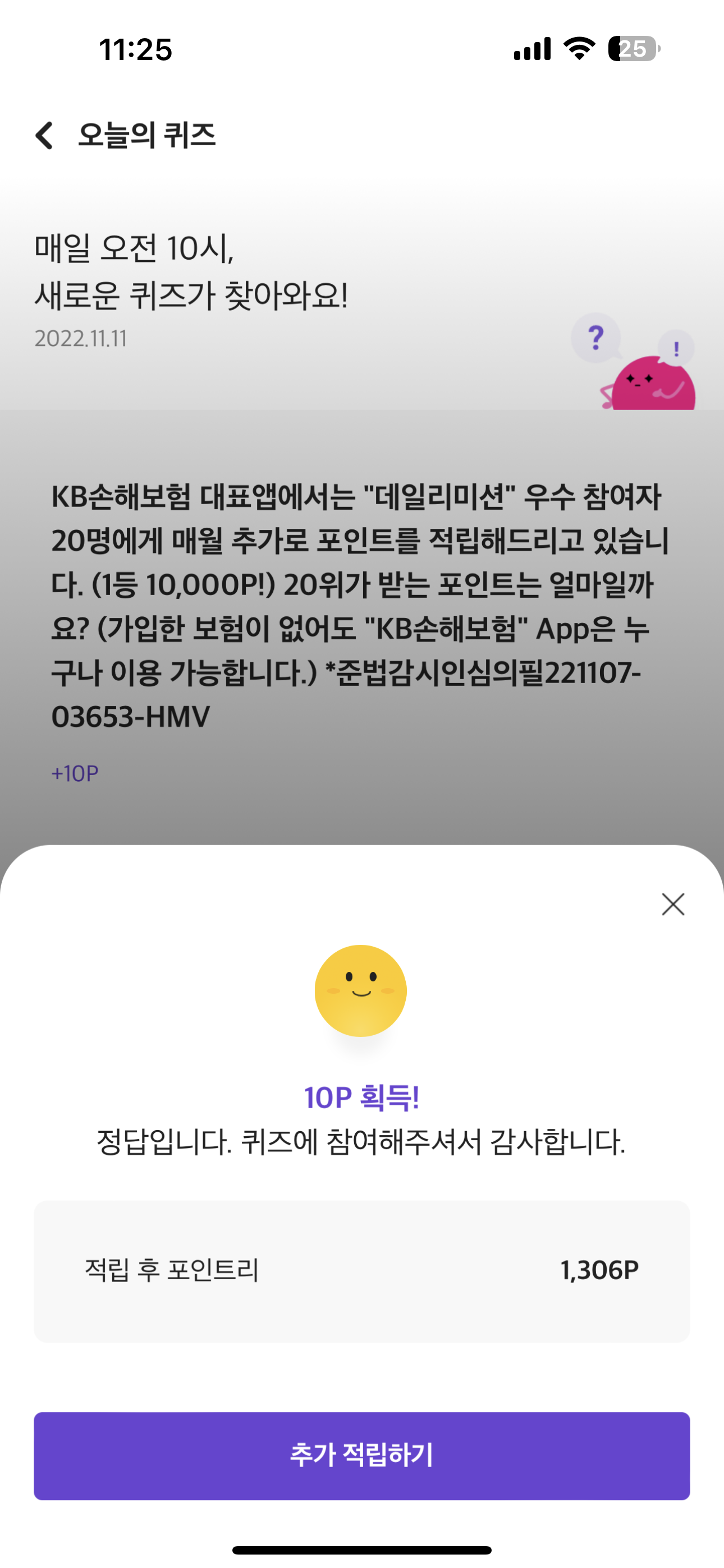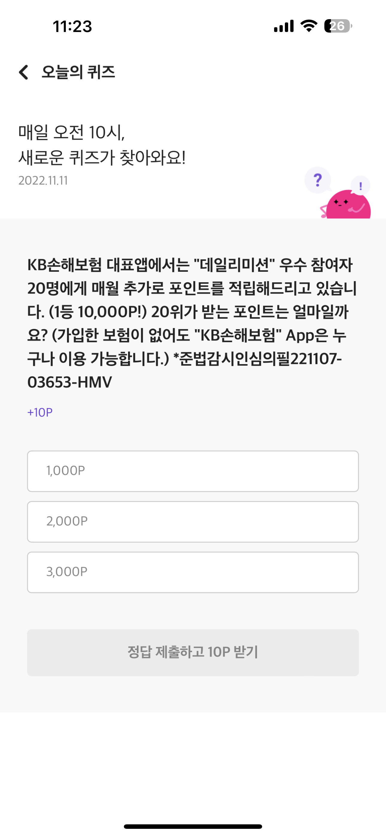 KB손해보험 대표앱에서는 "데일리미션" 우수 참여자 20명에게 매월 추가로 포인트를 적립해드리고 있습니다. (1등 10,000P!) 20위가 받는 포인트는 얼마일까요? (가입한 보험이 없어도 "KB손해보험" App은 누구나 이용 가능합니다.) "준법감시인심의필221107-03653-HMV