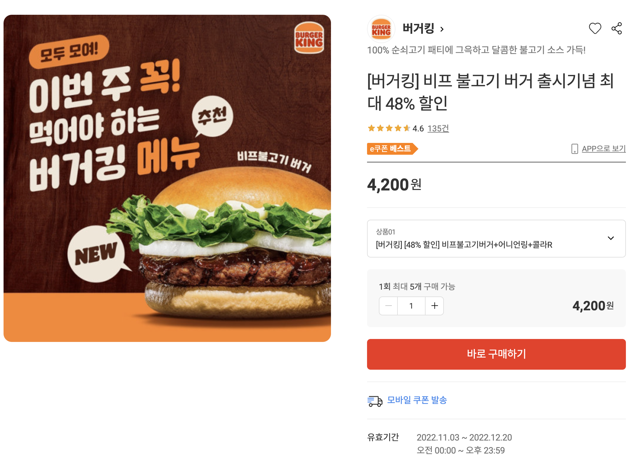 버거킹에서 비프 불고기 버거 출시기념 48% 할인 행사를 하고 있습니다. 요즘 물가가 많이 올라 패스트푸드 가격도 많이 올랐는데요. 저렴하게 먹을 수 있으니 참고해 보시기 바랍니다.