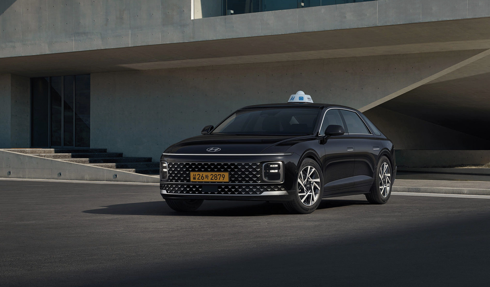 디 올 뉴 그랜저 택시 모습입니다. 전체적인 디자인은 기본 디 올 뉴 그랜저와 차이가 없고 택시 램프만 올라간 것을 알 수 있습니다. 전면 헤드램프는 수평형 LED 램프가 적용되어 상징적인 디자인을 보여주고 있습니다.