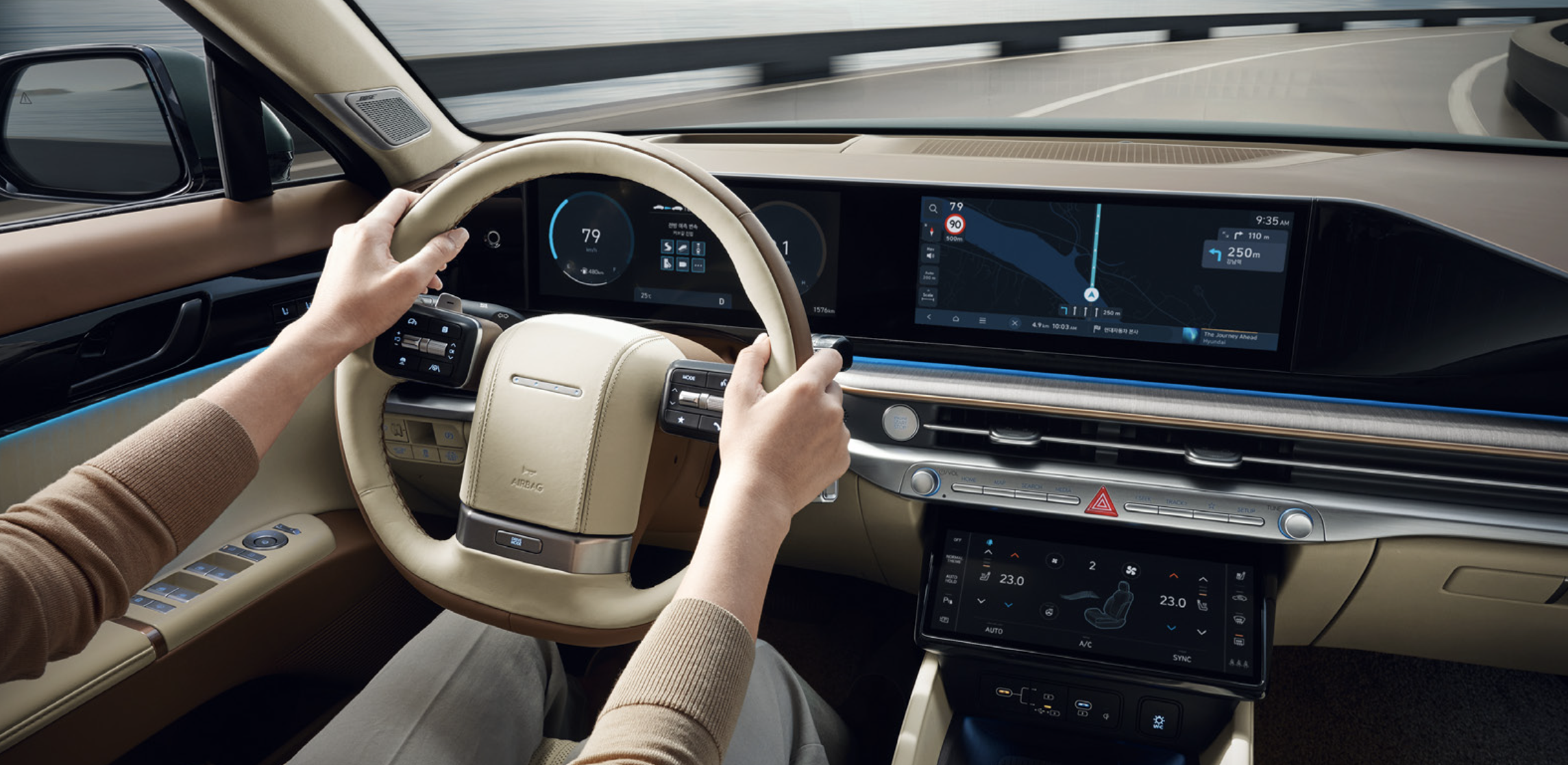 디 올 뉴 그랜저는 실내 디자인에도 신경을 많이 썼습니다. 12.3인치 클러스터와 12.3인치 내비게이션 디스플레이를 가로로 배치했고 10.25인치 공조 컨트롤러까지 첨단 이미지를 보여주고 있습니다.