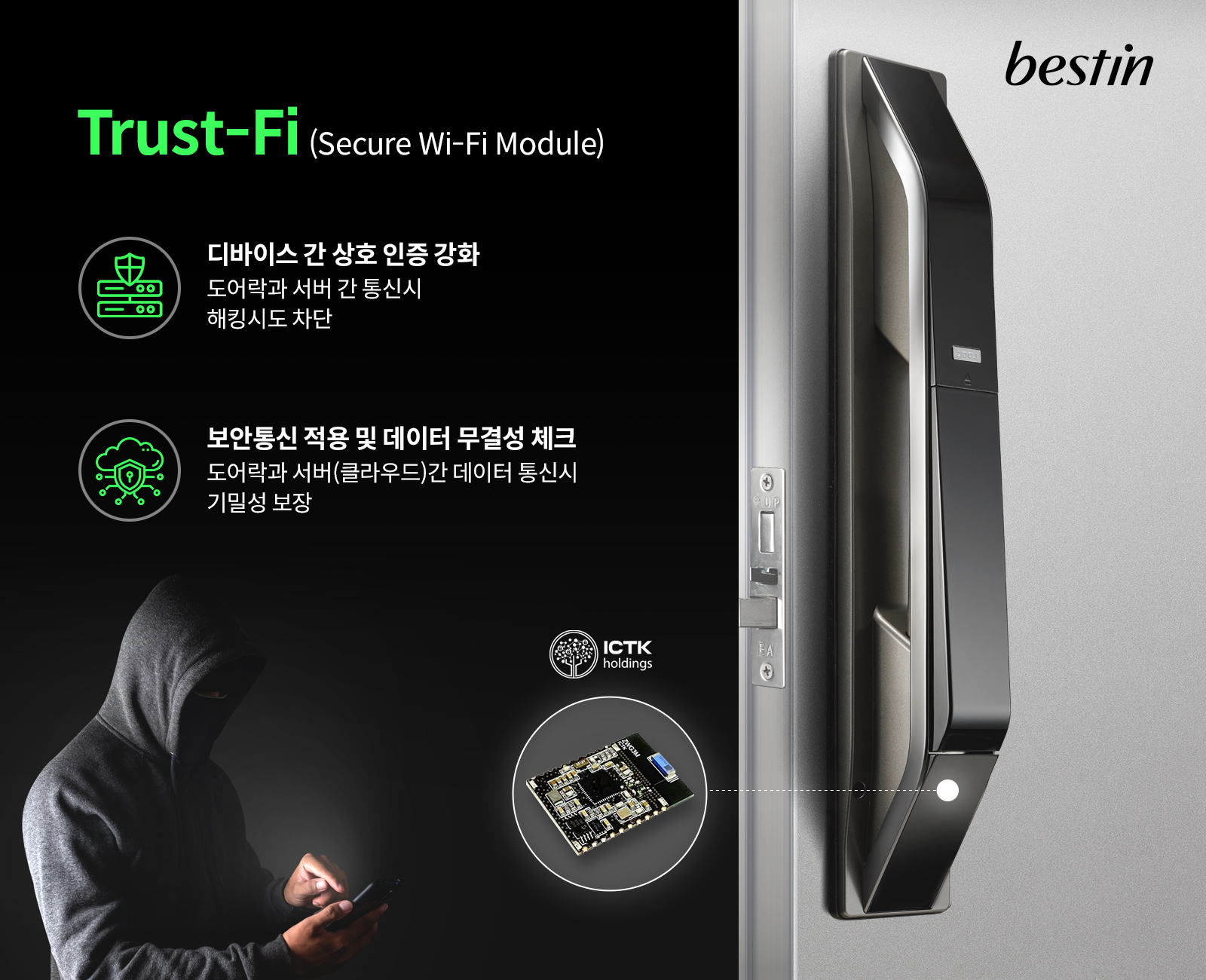 스마트 도어락 시대가 되면서 아무래도 해킹 위험이 존재하는데요. 베스틴 도어락은 이를 막고자 세계 최초 Wi-Fi 네트워크 통신 보안 모듈을 도어락에 적용했습니다. Trust-Fi 라고 도어락과 서버간 보안통신 적용 및 데이터 무결성 체크로 해킹시도를 차단해 주고 있습니다. 그리고 실내 측 설치된 주키 하부에 도입되어 물리적 해킹도 원천 차단하고 있어 안심하고 사용할 수 있습니다.