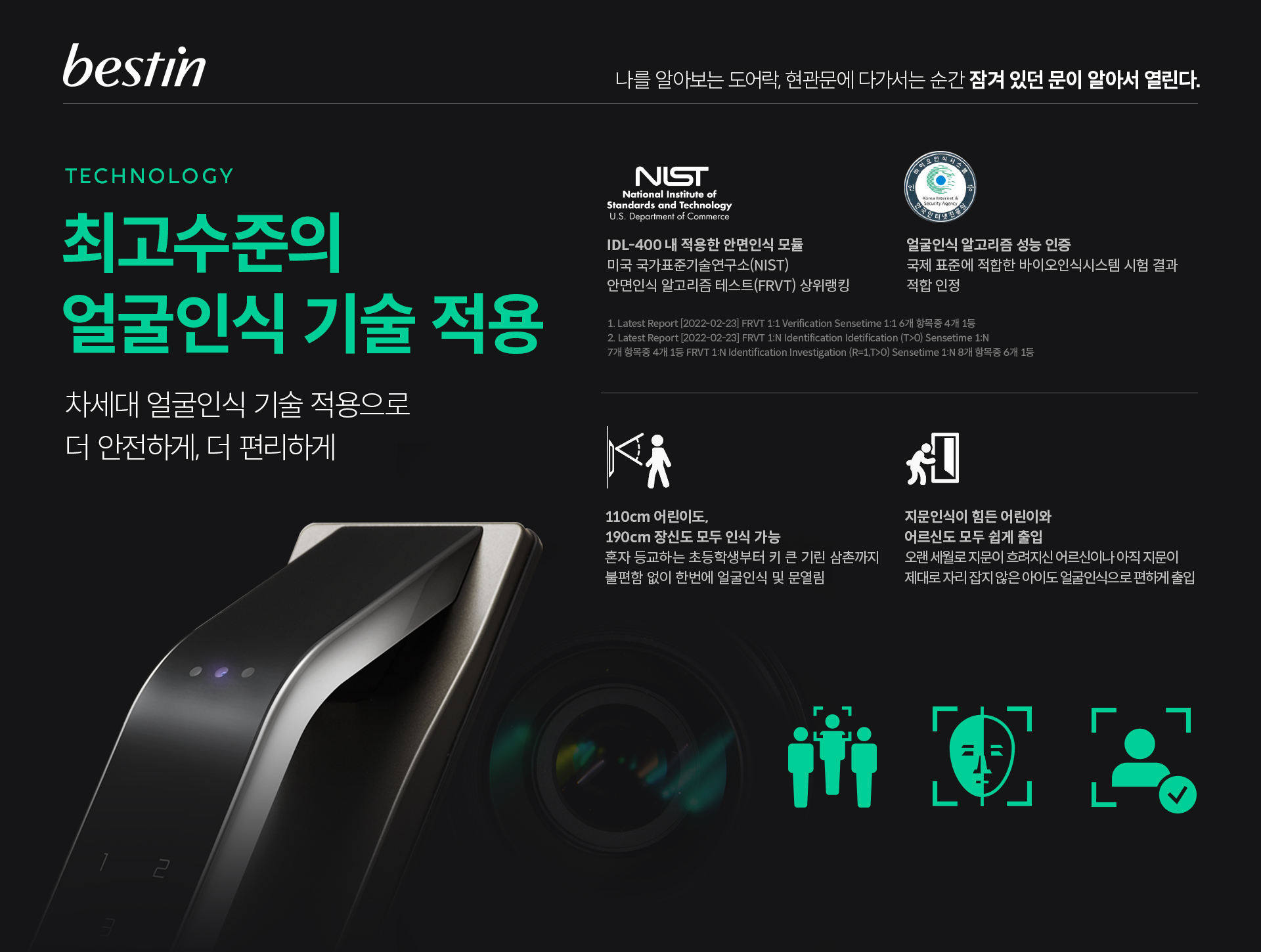 그래서 HDC랩스 베스틴 도어락도 얼굴인식 기능이 적용되어 더욱 편하고 완벽한 보안 기술을 보여주고 있습니다. 세계 최고 수준의 Vision AI 솔루션을 탑재해 얼굴인식의 정확도를 높였습니다. 베스틴 도어락 IDL-400에 적용한 안면인식 모듈은 미국 국가표준기술연구소(NIST)와 한국인터넷진흥원(KISA)의 알고리즘 테스트를 상위권으로 통과했습니다. 이는 국제 표준에 적합한 안면인식 모듈의 정확성과 보안성을 평가한 실험이라고 보시면 되는데요. 여러 제품들과 비교했을때도 더욱 뛰어난 얼굴인식으로 완벽한 보안을 하고 있다는 걸 입증해주는 결과입니다.