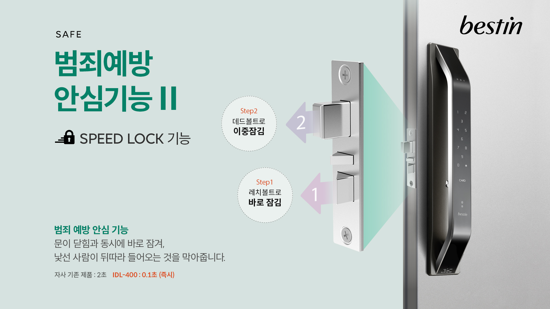 베스틴 도어락은 도어락에서 항상 걱정하게 되는 보안 부분에 더욱 신경을 쓰고 나왔습니다. 스피드락 기능을 적용해 문이 즉시 잠기도록 해두었습니다. 보통 도어락의 경우 문을 닫고도 약간의 시간을 두고 잠기기 때문에 그 사이 문을 열 수 있는데요. 문이 닫히고 바로 잠기기 때문에 낯선 사람이 뒤따라 들어오는 것을 방지할 수 있습니다. 영화나 드라마 속 범죄 상황을 생각해 보시면 쉽게 이해가 되실 것입니다. 문을 열고 들어가는데 범죄자가 숨어 있다가 바로 문을 열고 들어오죠. 생각만 해도 끔찍하네요