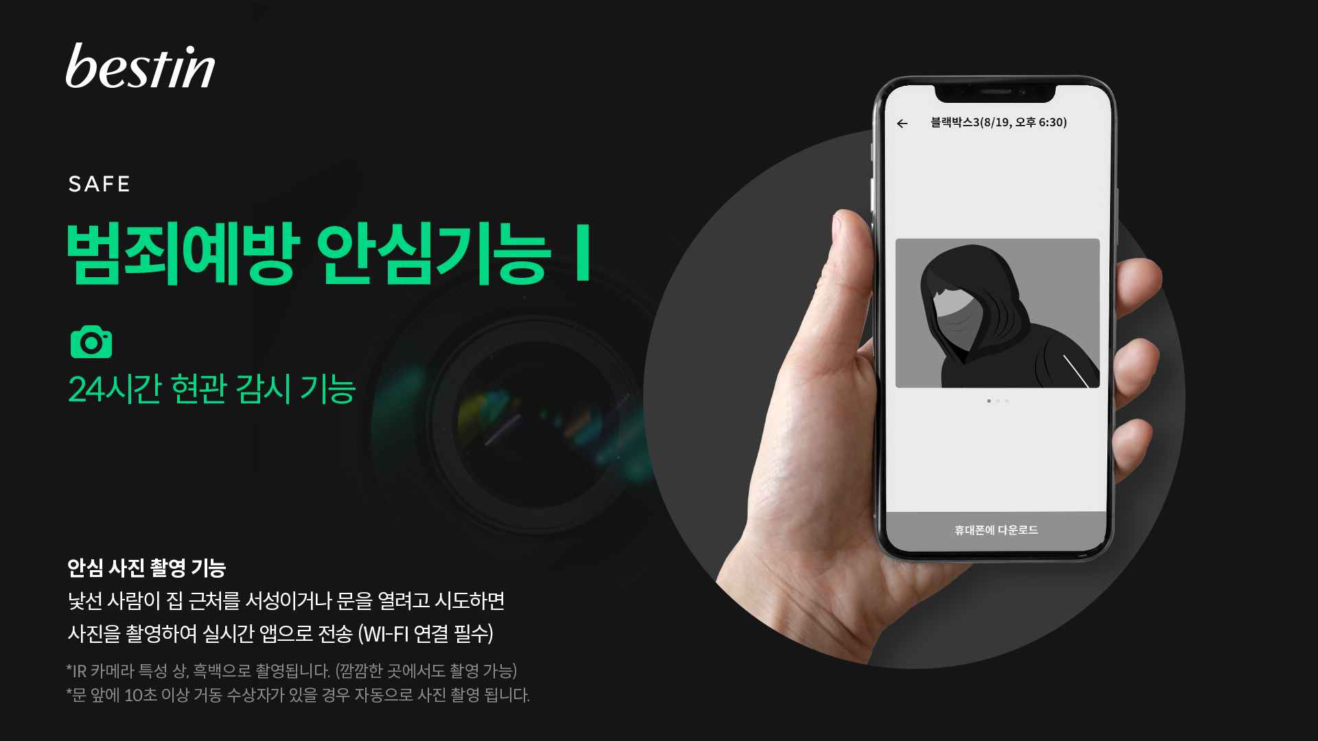 요즘엔 택배 분실이라든지 사건 사고로 인해 문 앞에 CCTV를 다는 사람들이 많아지고 있습니다. 그런데 그 역할을 베스틴 도어락이 보조적인 역할을 해줄 수 있습니다. 얼굴 인식 도어락에 한하여 베스틴 도어락 앱에서는 24시간 현관 감시 및 안심 사진 촬영 기능을 제공하는데요. 장시간 집을 비울때 사용하는 홈 안전모드와 안심 촬영 기능으로 스틸컷 촬영을 지원합니다. 블랙박스 처럼 실시간 영상을 담는건 아니고 현관 앞을 누가 서성이거나 강제로 문을 열려고 하면 앱으로 사진을 전송해 주는 기능입니다.