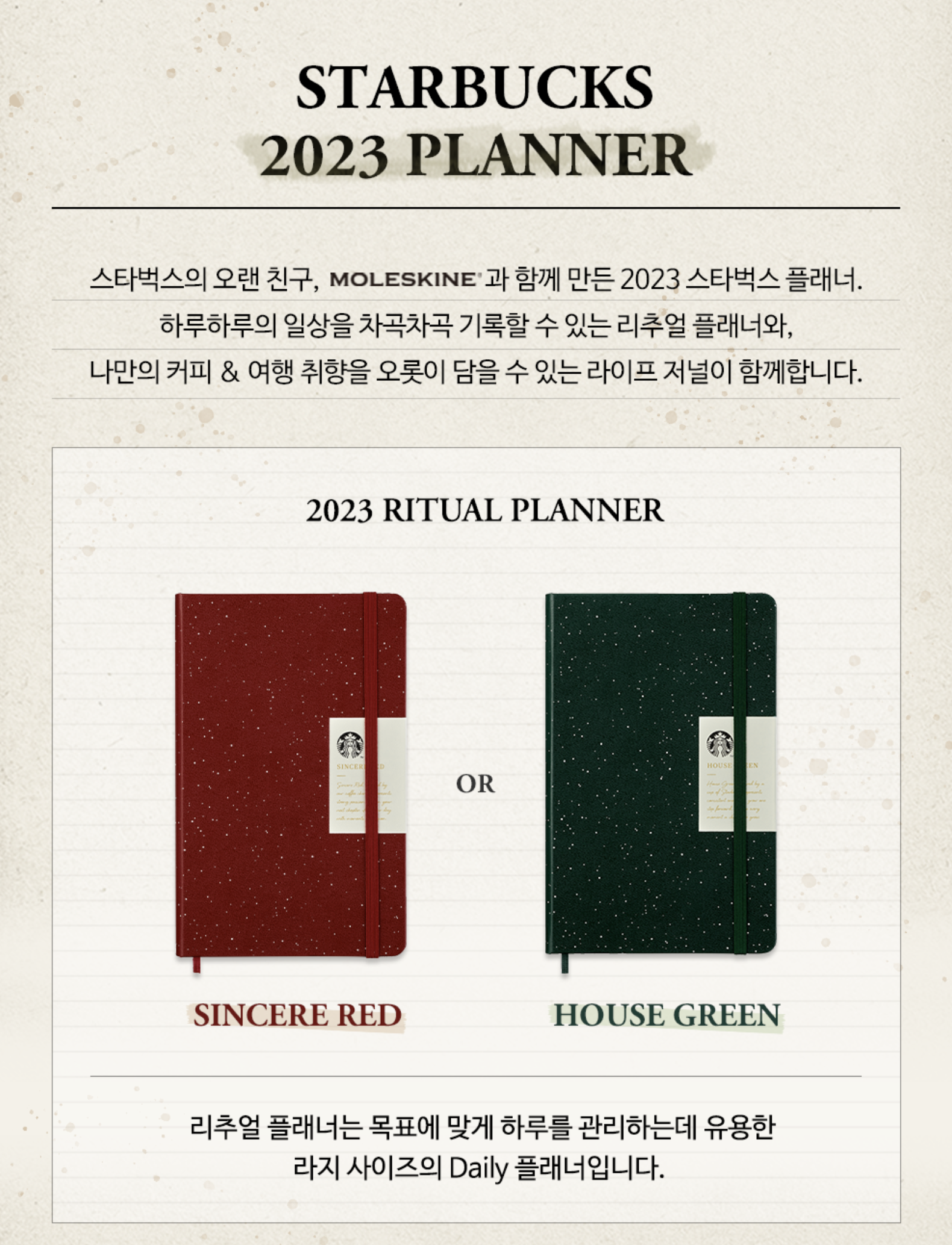 2022 스타벅스 윈터 e-프리퀀시를 다 모으면 2023 스타벅스 플래너 다이어리를 받을 수 있는데요. 기본 2023 스타벅스 플래너는 2가지 색상으로 구성되어 있고 몰스킨 제품입니다. 한해를 기록하기에 좋은 다이어리죠