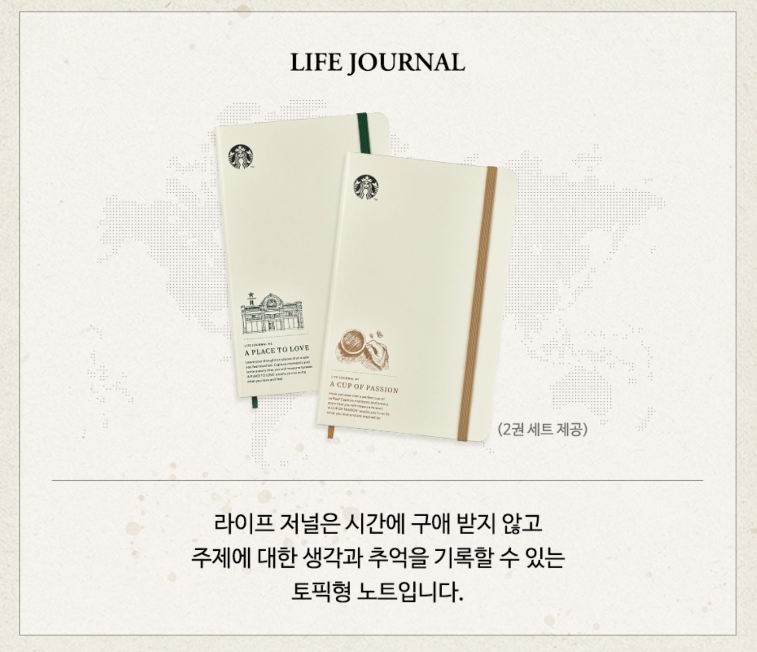 그리고 스타벅스 라이프 저널도 있습니다. 이건 시간에 구애 받지 않고 자유롭게 생각과 추억을 기록할 수 있는 토픽형 노트 입니다. 2권 세트로 제공되니 괜찮죠?