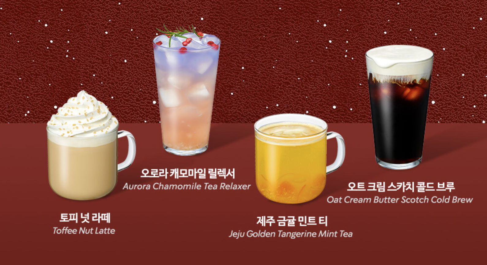 2022 스타벅스 윈터 e-프리퀀시 미션 음료입니다. 토피 넛 라떼, 오로라 캐모마일 릴렉서, 제주 금귤 민트 티, 오트 크림 스카치 콜드 브루 맛있겠죠? 그럼 상품 선물은 도전할만한 가치가 있을까요?