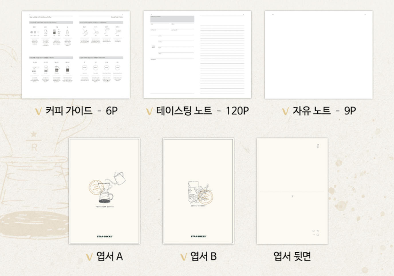 2023 스타벅스 라이프 저널 속지 모습입니다. 커피가이드도 있고 자유롭게 작성할 수 있는 페이지, 엽서 등으로 구성되어 있습니다.