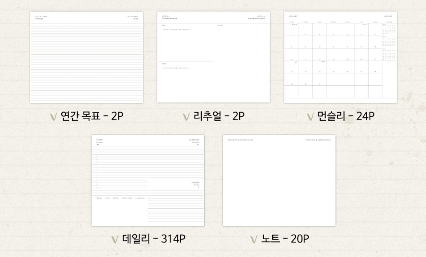 2023 스타벅스 플래너 속지는 이렇게 되어 있습니다. 연간목표, 월, 일, 노트로 구성되어 있습니다.