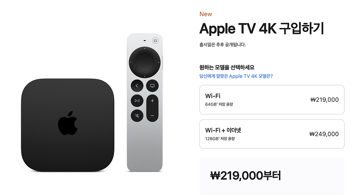 애플 TV 4K 3세대 가격은 WiFi 모델 219,000원, 이더넷 모델 249,000원으로 나왔습니다. 가격은 착하게 나왔기 때문에 잘 고민해 보시고 좋은 선택하시면 될 것 같습니다.