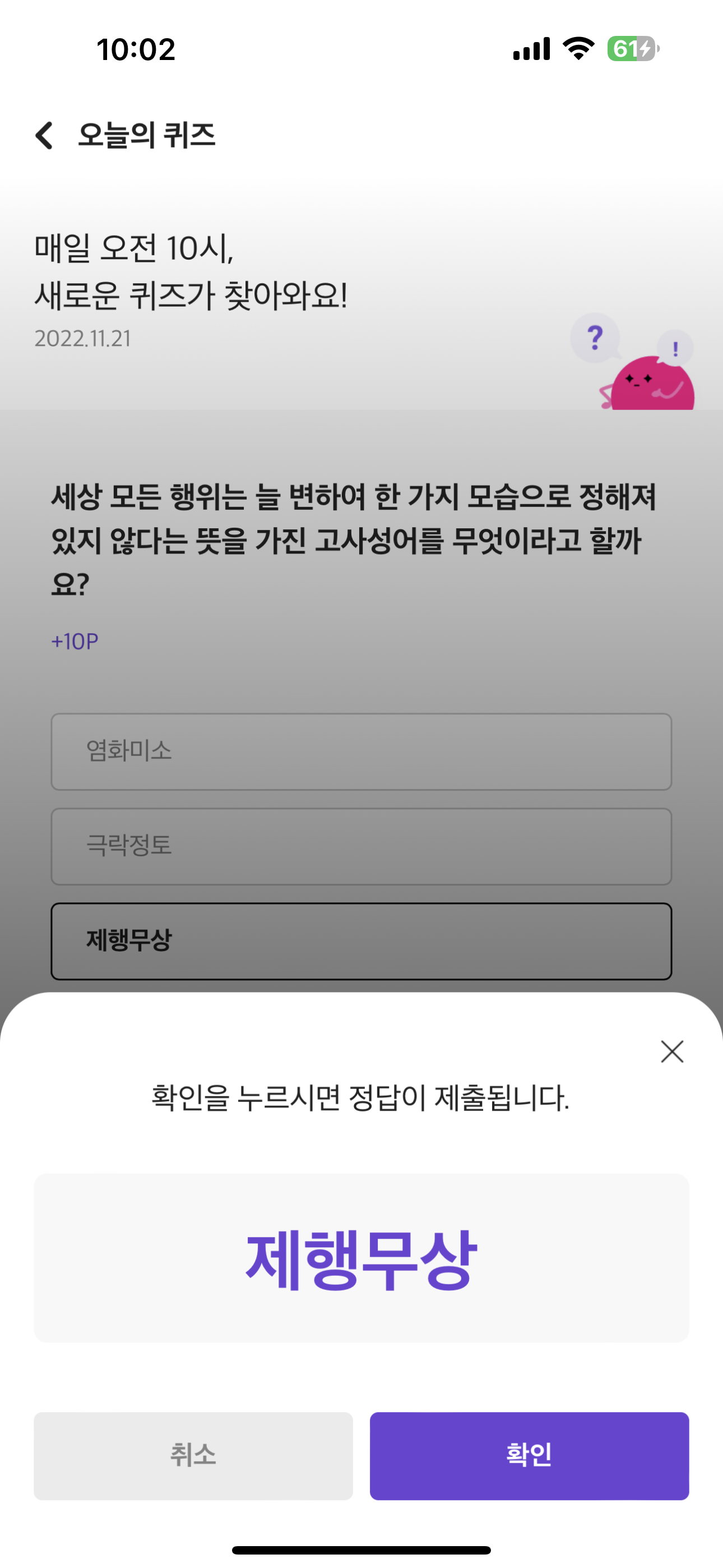 리브메이트 오늘의 퀴즈 정답은 제행무상 입니다
