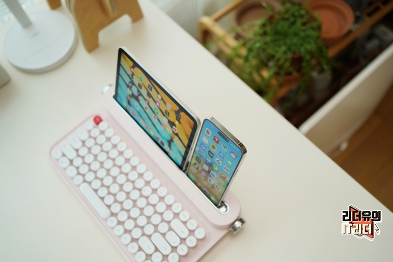 아이패드 미니 6세대의 경우는 옆에 공간이 많이 남으니 아이폰14 프로 맥스까지 함께 거치가 가능합니다. 스마트폰도 거치를 하고 사용하는 경우가 많이 있기 때문에 두 제품을 한번에 사용할 수 있다는 점이 장점입니다.
