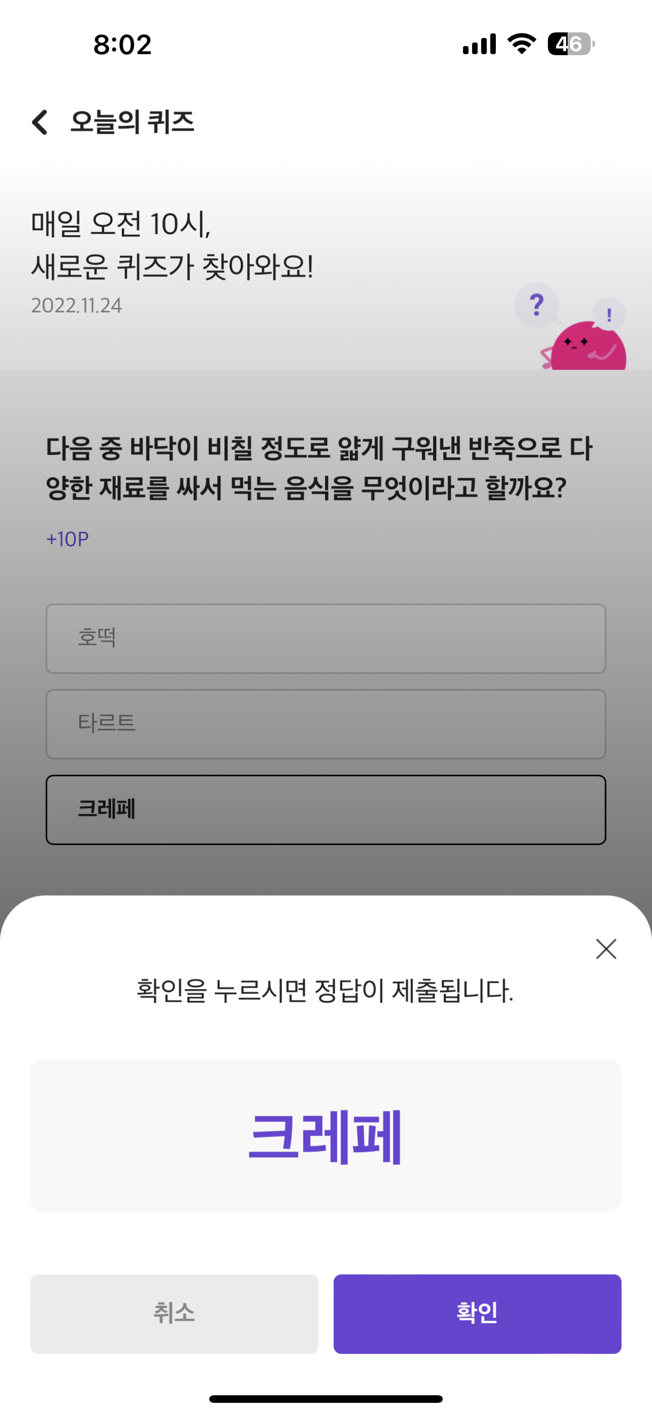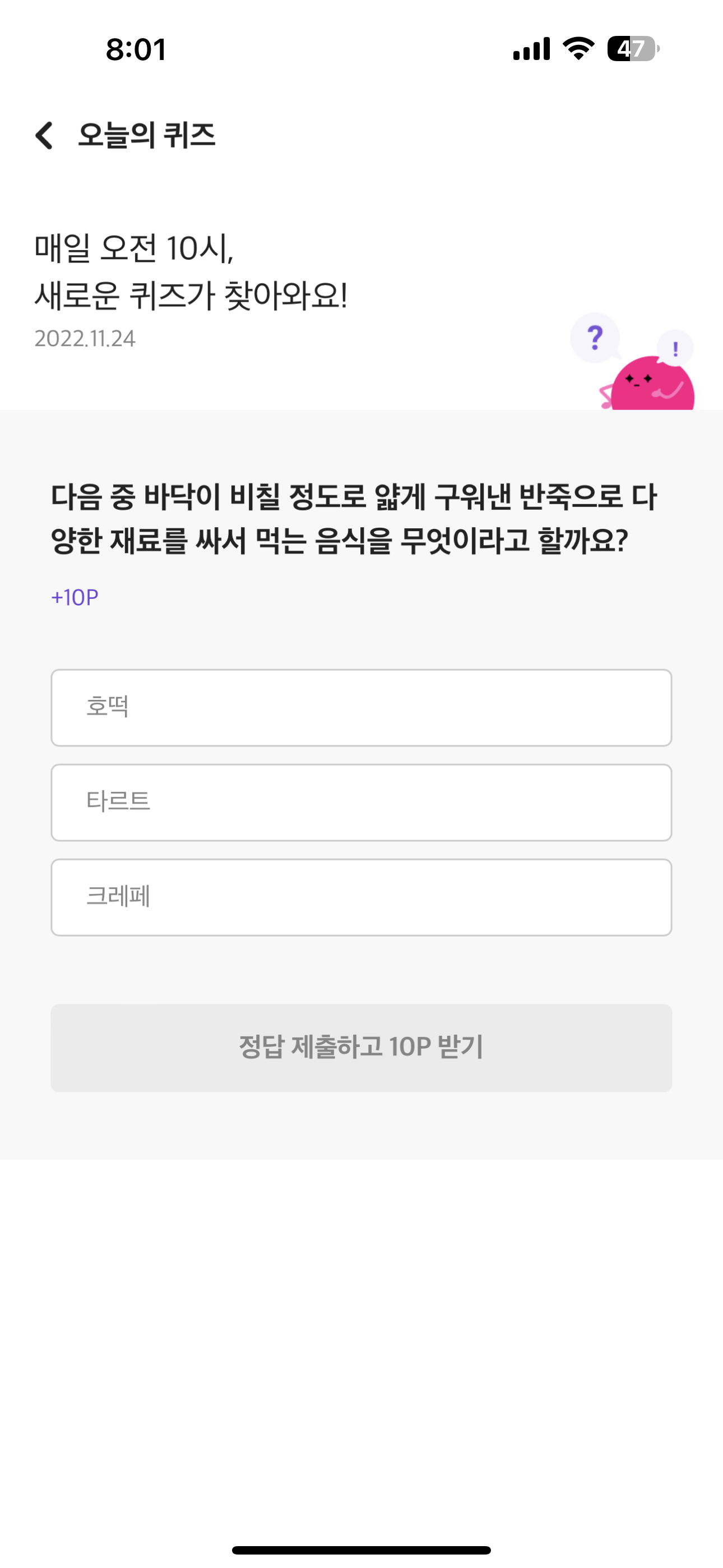 리브메이트 오늘의 퀴즈 정답은 크레페 입니다.