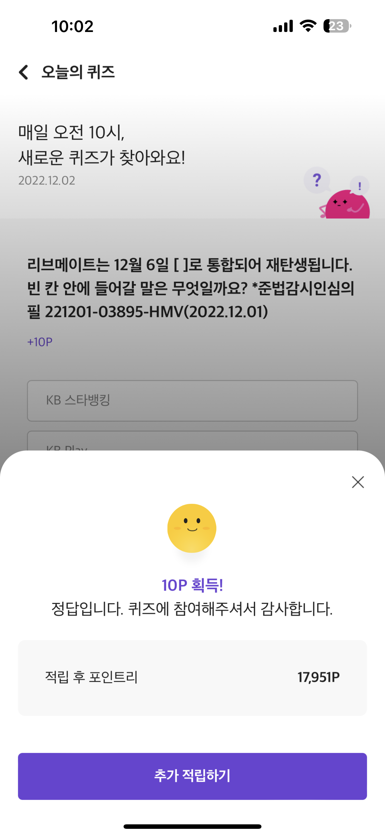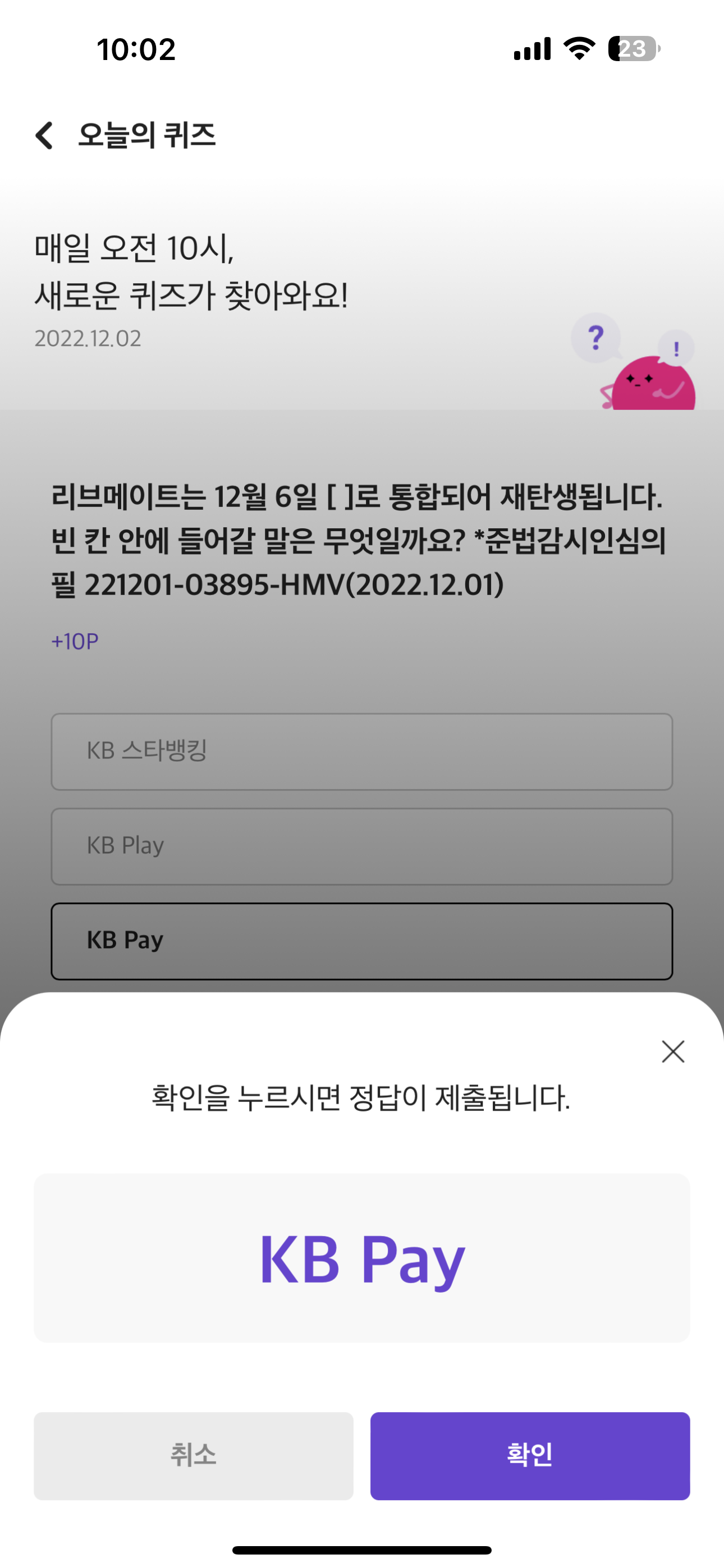 리브메이트 오늘의 퀴즈 정답은 KB Pay 입니다