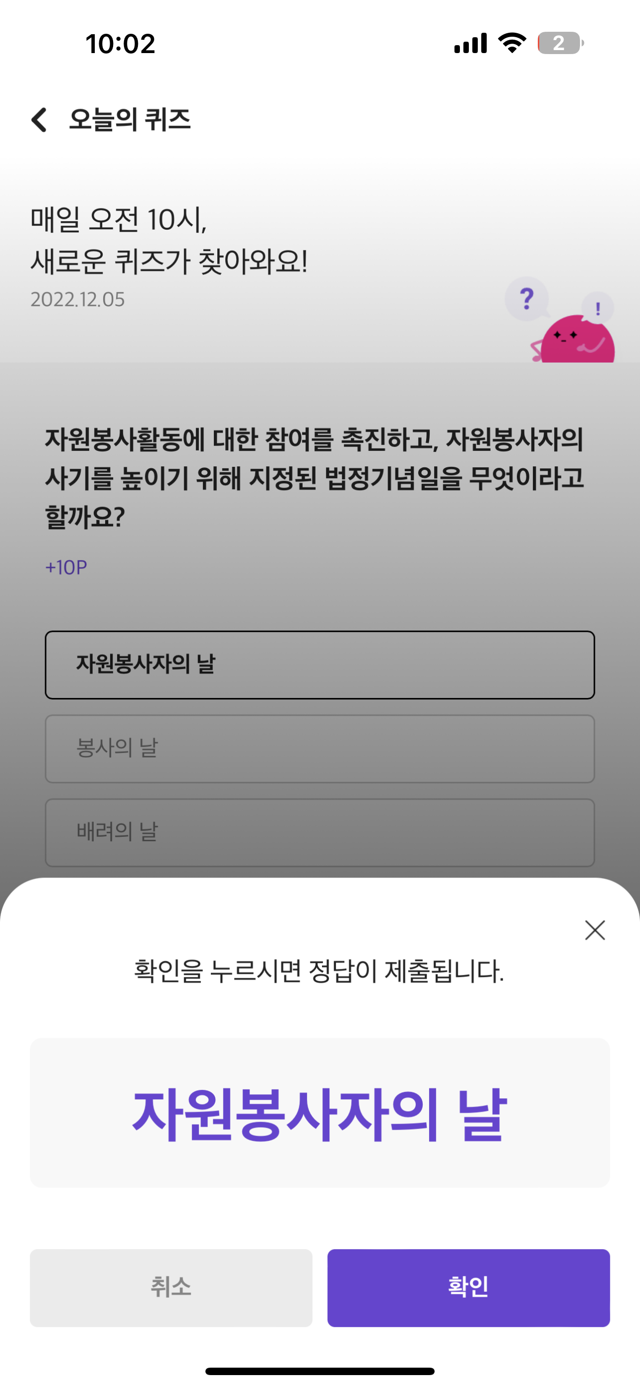 리브메이트 오늘의 퀴즈 정답은 자원봉사자의 날 입니다.