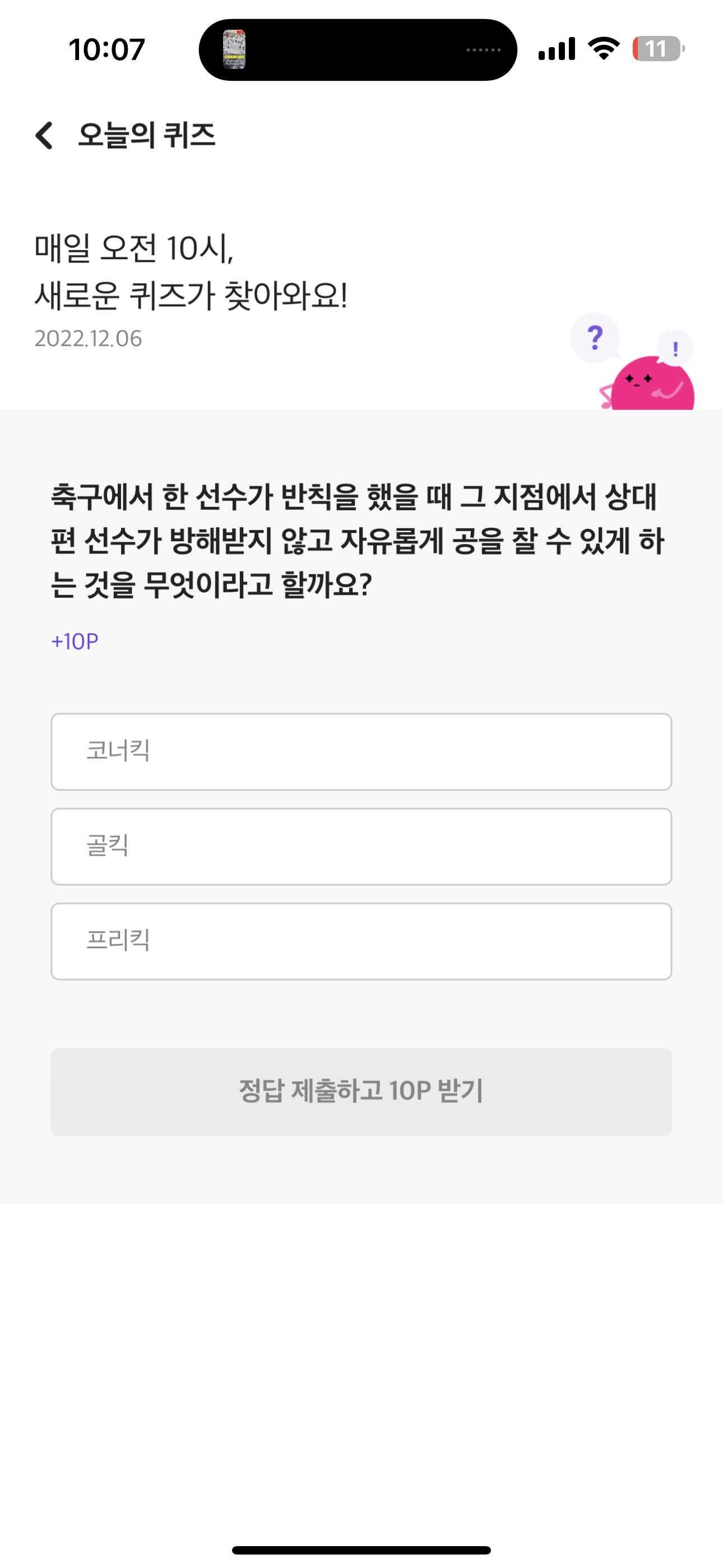 리브메이트 오늘의 퀴즈 정답은 프리킥 입니다
