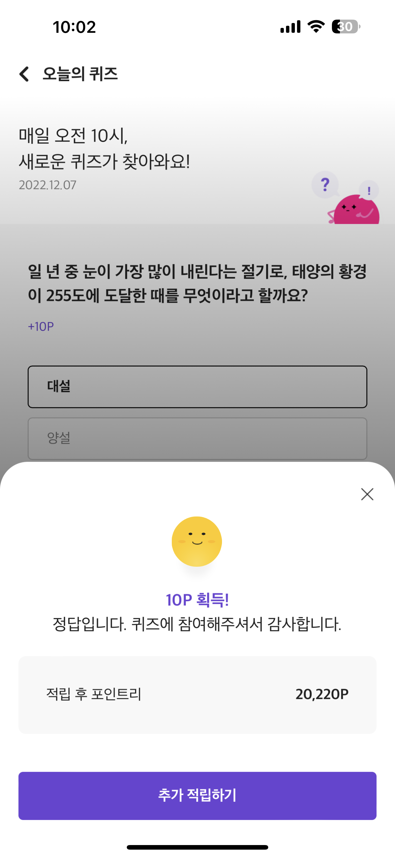 리브메이트 오늘의 퀴즈 12월 7일 정답 ( 일 년 중 눈이 가장 많이 내린다는 절기로, 태양의 황경이 255도에 도달한 때를 무엇 )