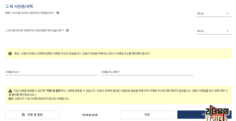 그리고 아래로 내리면 시민권/국적에 대해 물어보는데요. 해당 사항이 아니면 아니오를 체크해 주면 되고 이메일 주소를 입력하고 다음을 누릅니다.