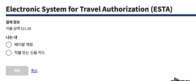 그리고 ESTA 비자 (이스타 비자) 가격, 수수료를 결제할 수 있는 페이지가 나옵니다.