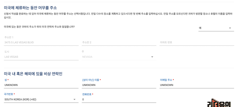 그리고 미국 내 해외에 있을 비상 연락인을 적으라고 하는데요. 이건 한국 사람이 아닌 현지에 있는 사람을 의미하는 것입니다. 즉, 연락할 사람이 당연히 없겠죠. UNKNOWN 이라고 입력을 해주면 됩니다.