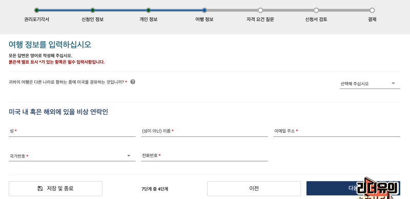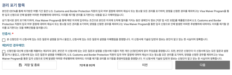 이제 여행 정보를 입력하게 나옵니다. 위에 보면 미국을 경유하는 것인지 목적지인지 선택하게 나옵니다. 여기서 경유하는게 아니라고 체크 하면