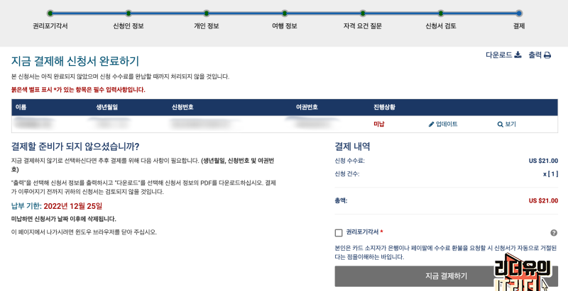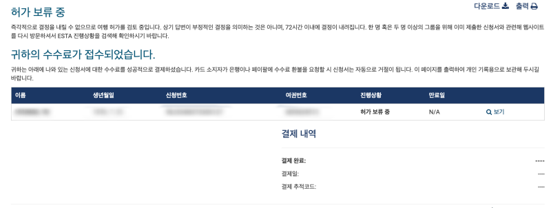 ESTA 비자 (이스타 비자) 결제가 완료되었습니다. 참고로 ESTA 비자 (이스타 비자) 발급 시간은 저의 경우는 반나절 걸렸습니다. 보통 2일은 예상해야 한다고 하는데 저는 비교적 빨리 나왔습니다.