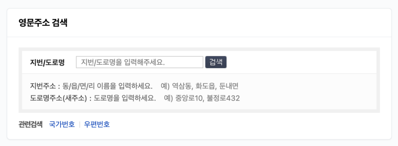 영문주소는 네이버에 가서 영문주소라고 하면 해당 서비스를 볼 수 있습니다. 여기서 지번/도로명을 입력하면 영문주소 확인이 가능합니다.