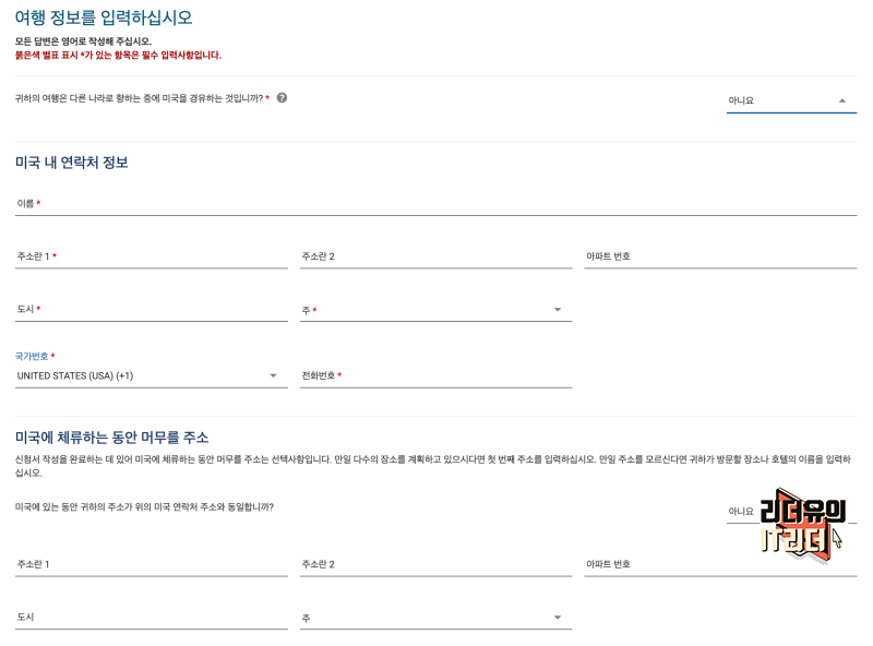 미국 내 연락처 정보를 넣을 수 있는 화면이 나옵니다. 미국에 지인이 사는게 아닌 미국 여행이라면 여기서 호텔 정보를 넣으시면 됩니다. 이름에 호텔 이름을 적고 주소도 관련 내용에 따라 적으시면 됩니다.
