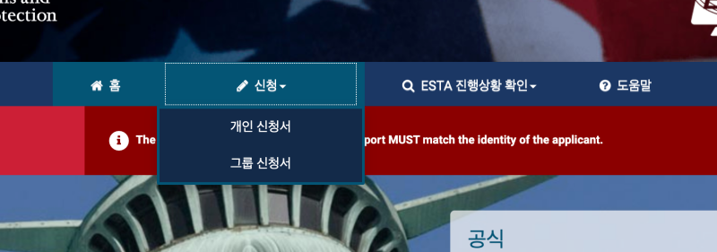 ESTA 비자 (이스타 비자) 발급 신청은 상단 메뉴의 신청으로 가서 개인일 경우 개인 신청서를 선택하면 됩니다.