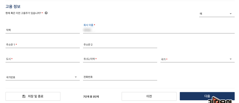그리고 고용 정보를 넣으라고 나옵니다. 여기는 회사 정보를 넣으면 되는 것입니다. 안다니고 있으면 아니오라고 체크하면 넣는 메뉴가 안나옵니다.